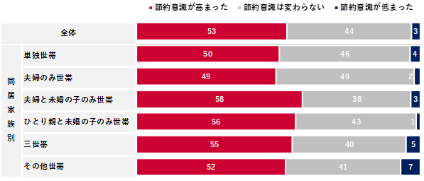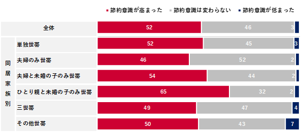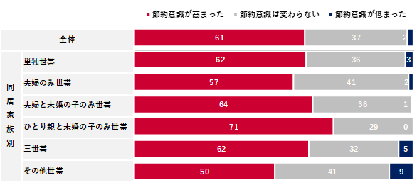 物価が上昇する前と比べた現在の節約意識を調査したところ、「節約意識が高まった」との回答は61%。同居家族別に見ると、「ひとり親と未婚の子のみ世帯」が最も高く71%、次いで「夫婦と未婚の子のみ世帯」が64%となった。子どもがいる世帯の節約意識が高まっている傾向が見られた。