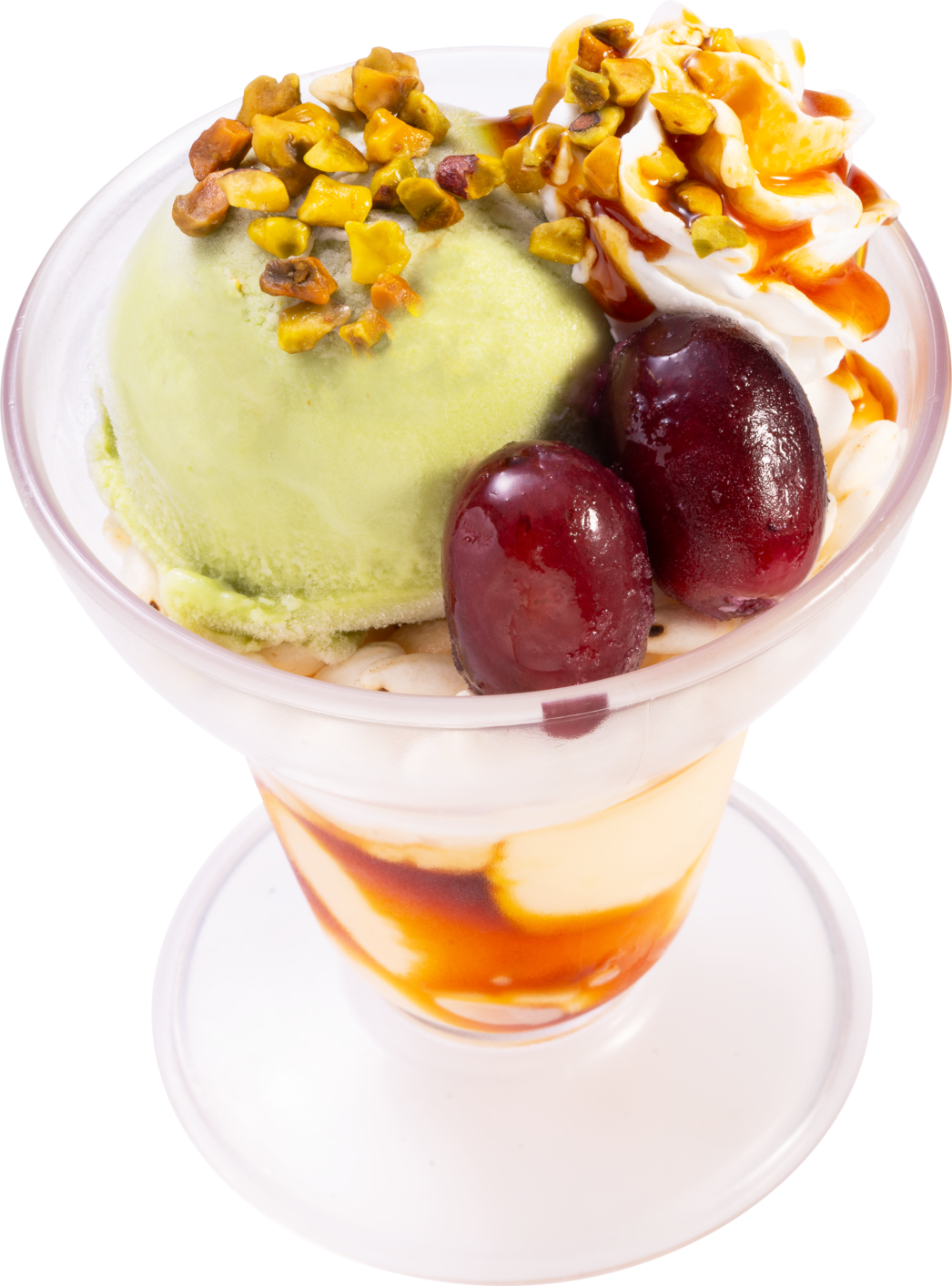 ピスタチオの香ばしくまろやかな味わいのアイスや人気のプレミアムプリン、フローズンのぶどうなどを盛り込み、ホイップクリーム、ローストピスタチオをトッピングしたパフェです。