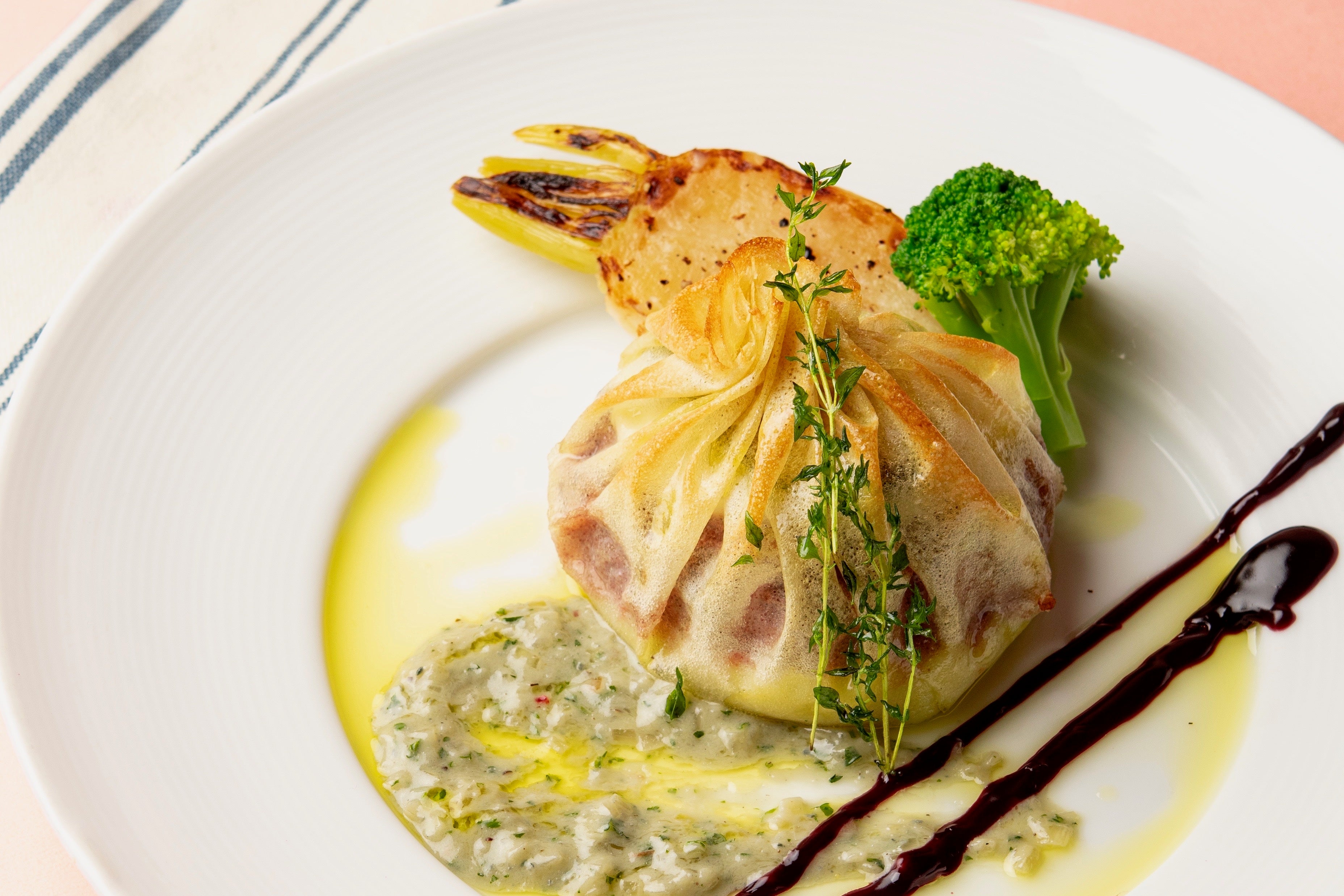 牛ヒレ肉に旬野菜とモッツァレラチーズを重ね、パートブリック(薄いクレープ上の皮)で包み焼きに。カットする瞬間のワクワク感と共にお楽しみください。