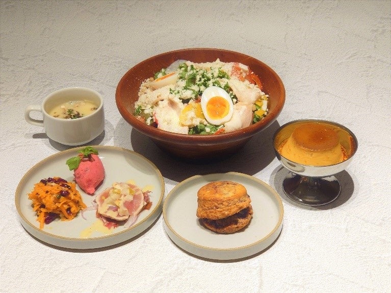 ①「レシピ」ゆで卵入りシーザーサラダ、②季節の日替わりデリ3種、スープ、ブルーベリー入りスコーン、③「レシピ」で作ったクレームキャラメルのランチセット