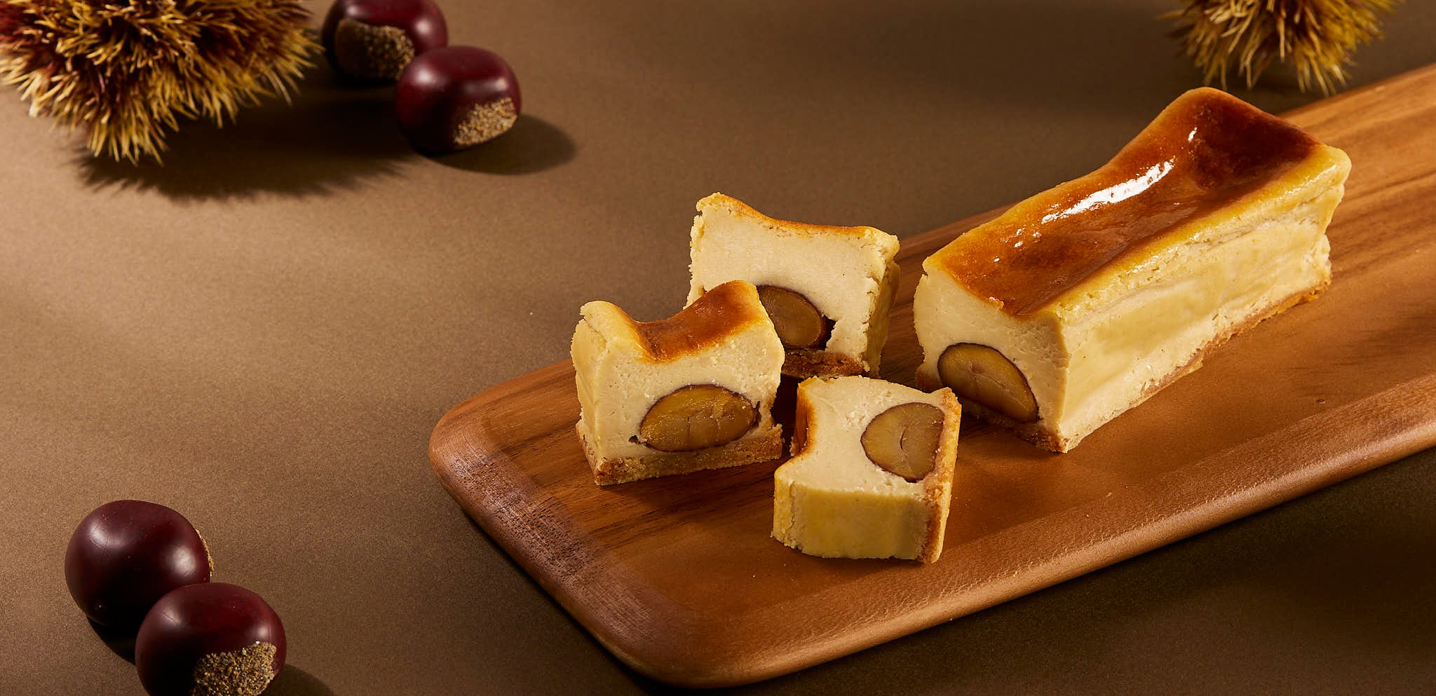 クッキー生地の上にまるごとの栗をぎっしりと並べ、北海道産のクリームチーズと茨城県産「利平栗」のペーストをチーズケーキに練り込み、じっくりと焼き上げました。
