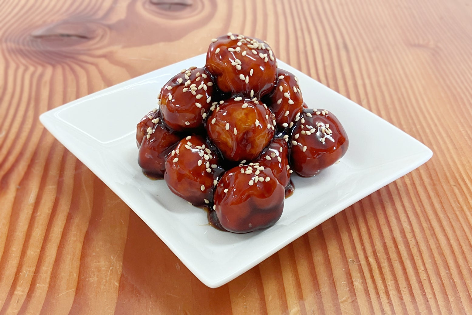 国産の鶏ミンチと野菜で作った肉団子に甘酢タレをからめました。