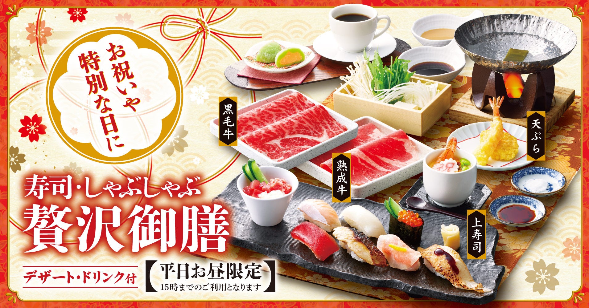「黒毛牛しゃぶしゃぶ肉」や「熟成牛しゃぶしゃぶ肉」と季節の上寿司が一度に味わえる、贅沢な御膳です。さらに、天ぷらや、お祝いメニュー限定の「贅沢茶碗蒸し」をお楽しみいただけます。デザート・ドリンクが付き、「スイートポテト大福」、「秋栗モンブラン」、「ぶどうのシャーベット&ゼリー」などの秋期間限定デザートもお選びいただけます。ご家族や大切な人のお祝いにぜひご利用くださいませ。こちらは、平日にご予約なしでご利用いただけます。法事や法要の際にも、お気軽にご相談ください。