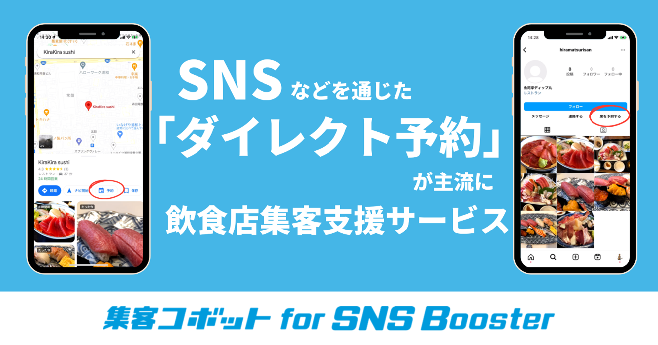 このような背景を踏まえ、instagramやLINEなどのSNSに特化した飲食店の空席確認・予約サービス「TABLE REQUEST」や、飲食店の発注業務を効率化する「SMART REQUEST」など飲食 DX サービスの開発・提供を行う株式会社Bespo(ビスポ、以下「Bespo社」)に当社は出資を行うとともにOEM契約を締結し、飲食店予約関連の包括サービス「集客コボットfor SNS Booster」を開始いたしました(※3)。本サービスは、席の予約機能に加え予約台帳機能や予約傾向のレポート機能を飲食店へ提供するものであり、本サービスを含む「販促支援のコボットシリーズ」(※4)において、1年で1万店舗への導入を目途としています。