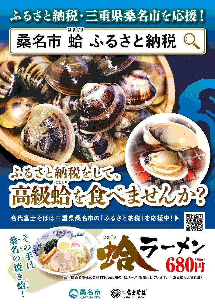 蛤ラーメンの販売を記念して、10月11日(日)10時30分から、名代富士そば品川店にて桑名市の伊藤徳宇市長を招いての試食&激励会を実施。また、同時刻より品川店限定20名先着で初代桑名藩主「本多忠勝の手ぬぐい」のプレゼントも実施する。