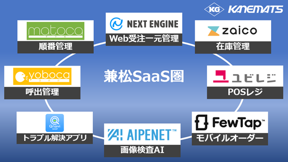 兼松に日々寄せられる顧客課題をDXの力で解決するため、SaaSを中心とした事業領域において、兼松は、タレットPOSレジや順番管理サービスなどの店舗DXサービスの拡充のため「兼松SaaS圏」を構築しております。