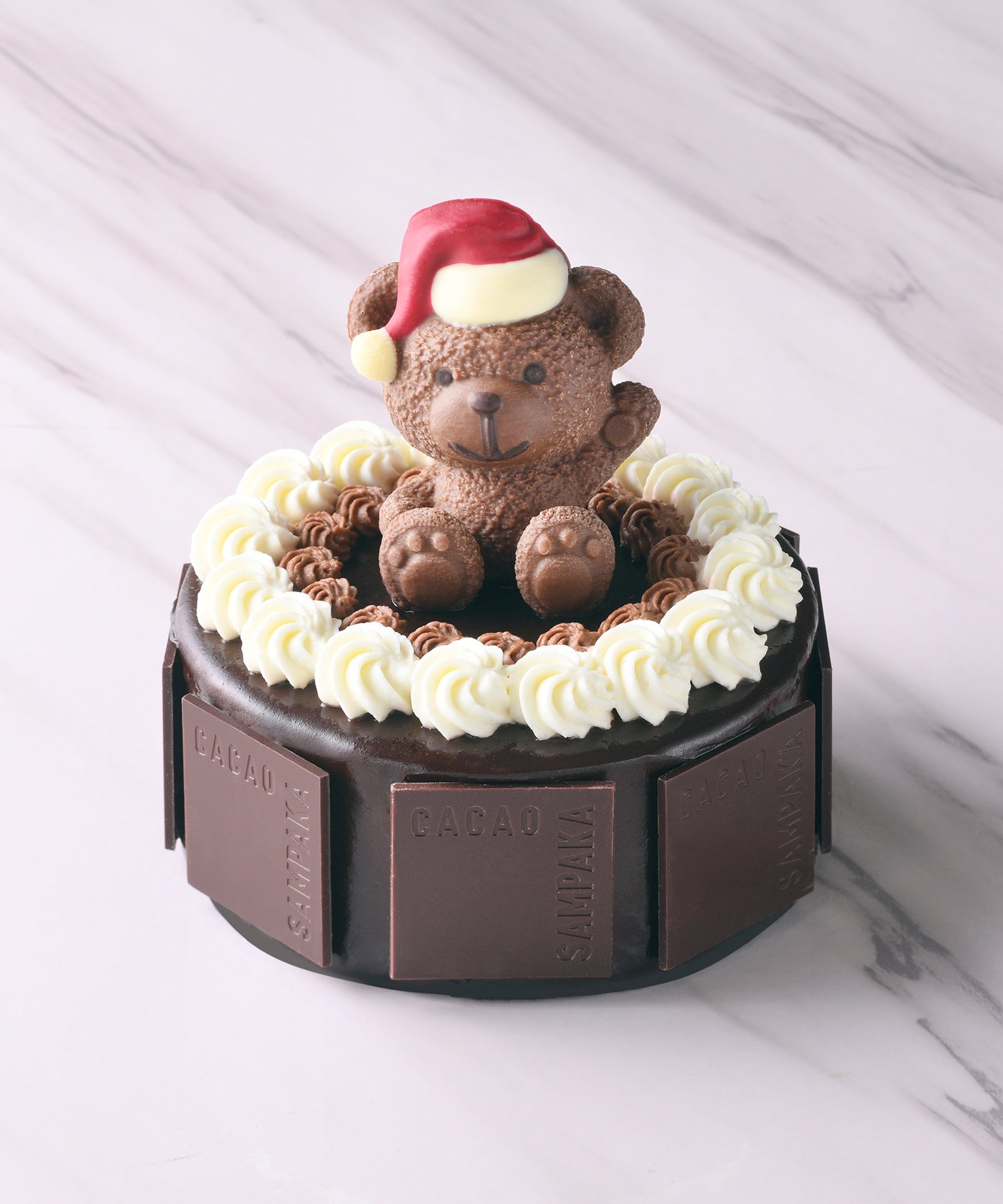 さくさくとした食感のビスキュイ生地と香ばしいアーモンドプラリネの上に、カカオ分70%のクーベルチュールを贅沢に使用したダークチョコレートムースが豊かな味わいを演出し、鮮やかなグラサージュで濃厚なカカオの香りを包みました。専属の職人がひとつひとつ丁寧に作り上げた、毛並みまで精巧に表現された可愛らしいベアチョコレートをご自身で乗せて完成。ベアチョコレートはカカオ分40%のまろやかなミルクチョコレート。