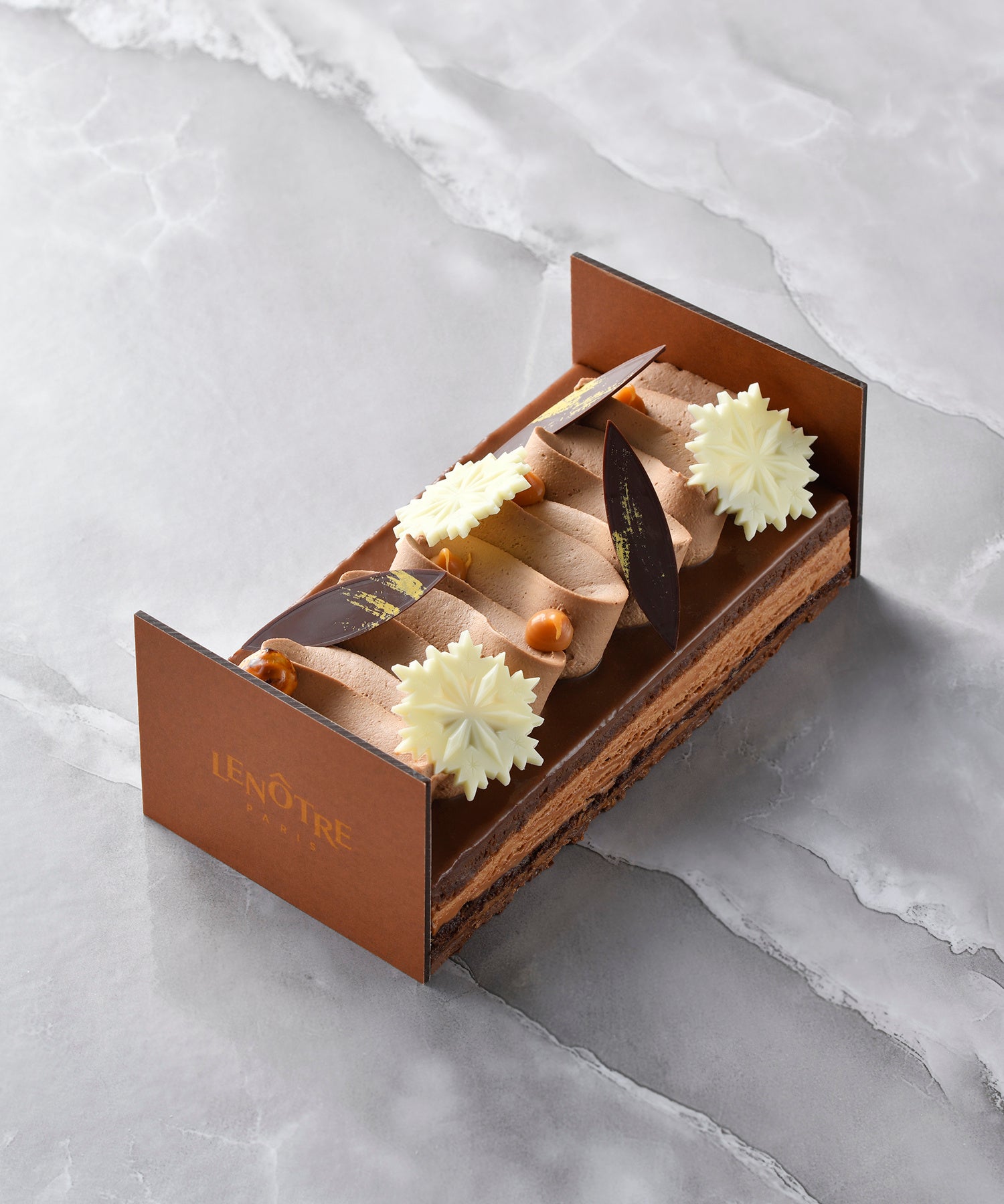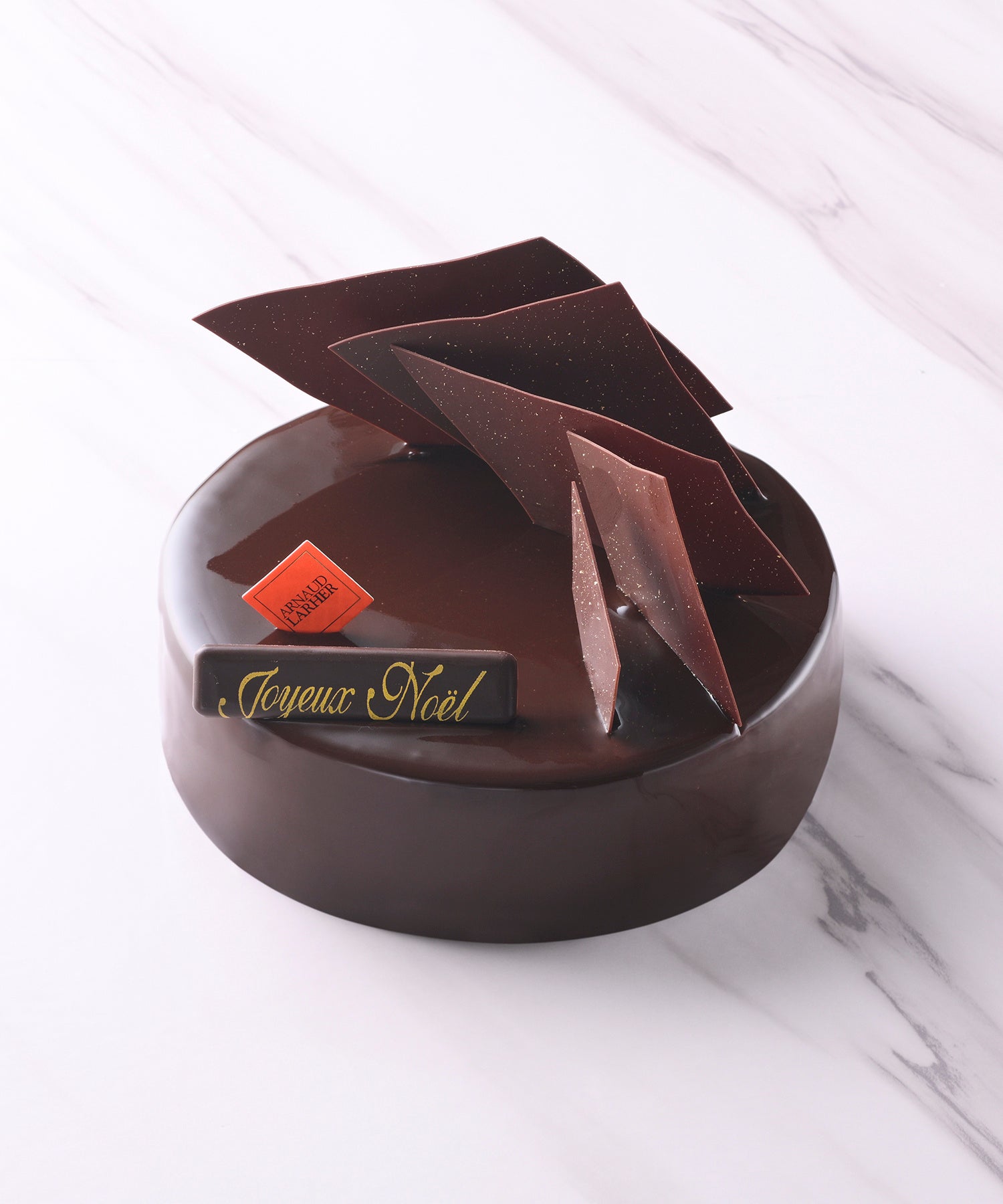 2023年新作のチョコレートとキャラメルのブッシュ・ドゥ・ノエル。7層のチョコレートのガナッシュやクリーム、スポンジ等と、2層のキャラメルのクリームで仕上げました。チョコレート好きにはたまらない、全9層が奏でる奥深い味わいのブッシュ・ドゥ・ノエルをお楽しみください。