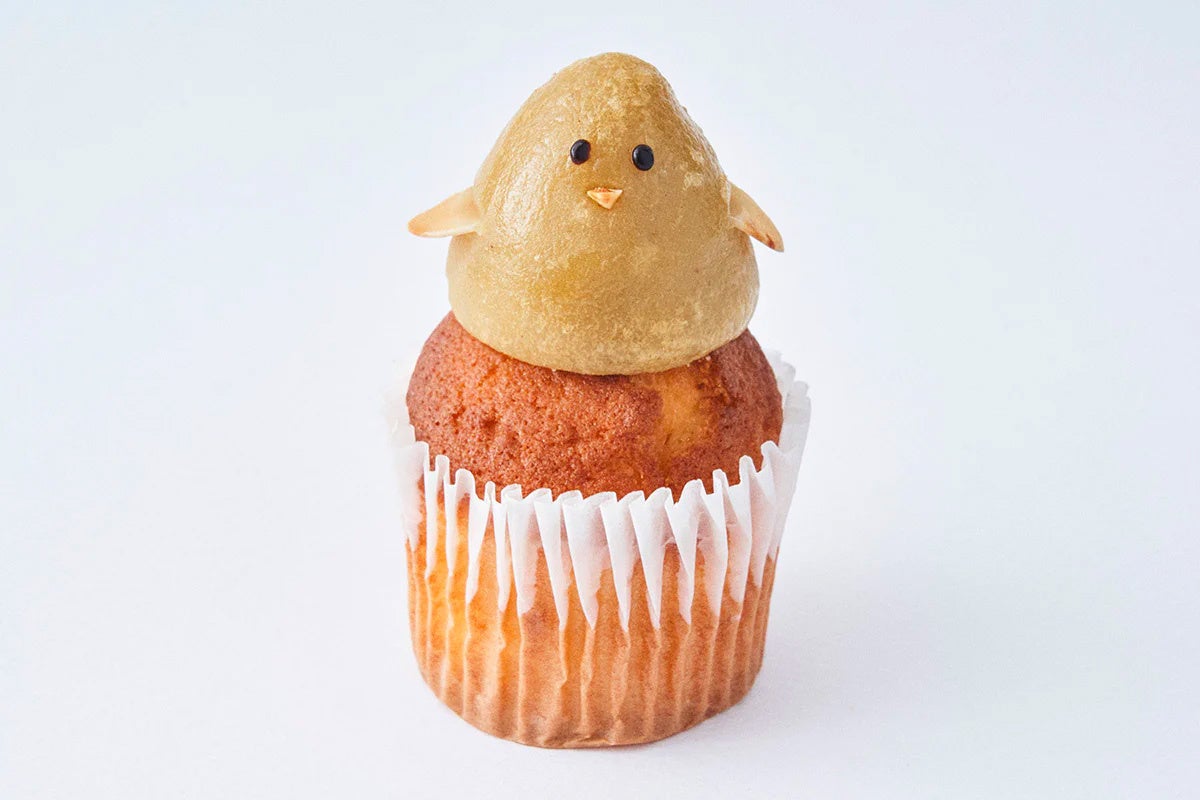 ○商品説明:優しい甘さのプレーンカップケーキにスイートポテトの可愛いひよこがちょこんと乗っています。スライスアーモンドの香ばしさが心地よいアクセントになっています。
