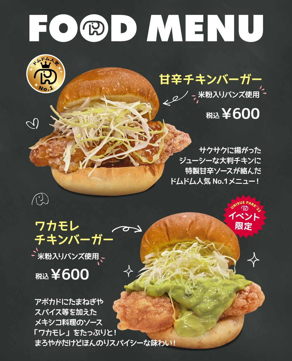 今回の出店では、フードメニューとしてドムドム人気No.1の「甘辛チキンバーガー(税込600円)」と、ユニークパーク’23限定「ワカモレチキンバーガー(税込600円)」の2種を販売いたします。具材のチキンは通常サイズの2.3倍の大きさでボリュームも満点です。