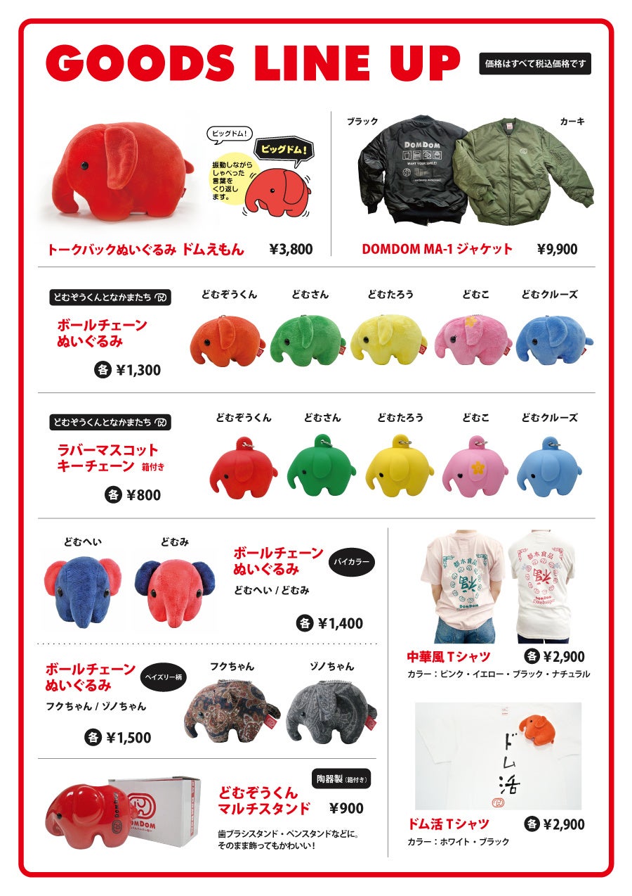 また、どむぞうくんボールチェーンぬいぐるみのレアカラー(過去販売商品)を数量限定で販売、そのほかドムドムオンラインショップで即完売した「DOMDOM MA-1ジャケット」や「中華風Tシャツ」なども再販売いたします。イベント会場価格のため、お値打ち価格です。