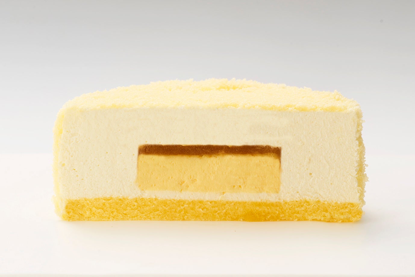 キャラメルソースとベイクドチーズケーキをレアチーズケーキでサンドし、周りをもふもふのスポンジ