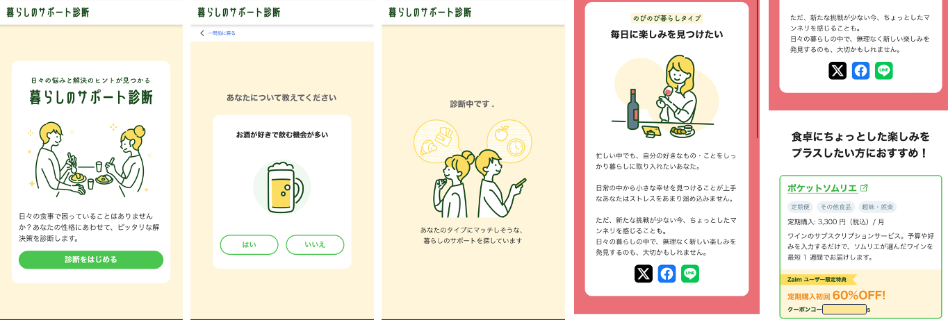 暮らしのサポート診断は、暮らしに関するアンケートを通じて一人ひとりの生活の価値観を分析し、暮らしのタイプを診断するZaimの新機能です。