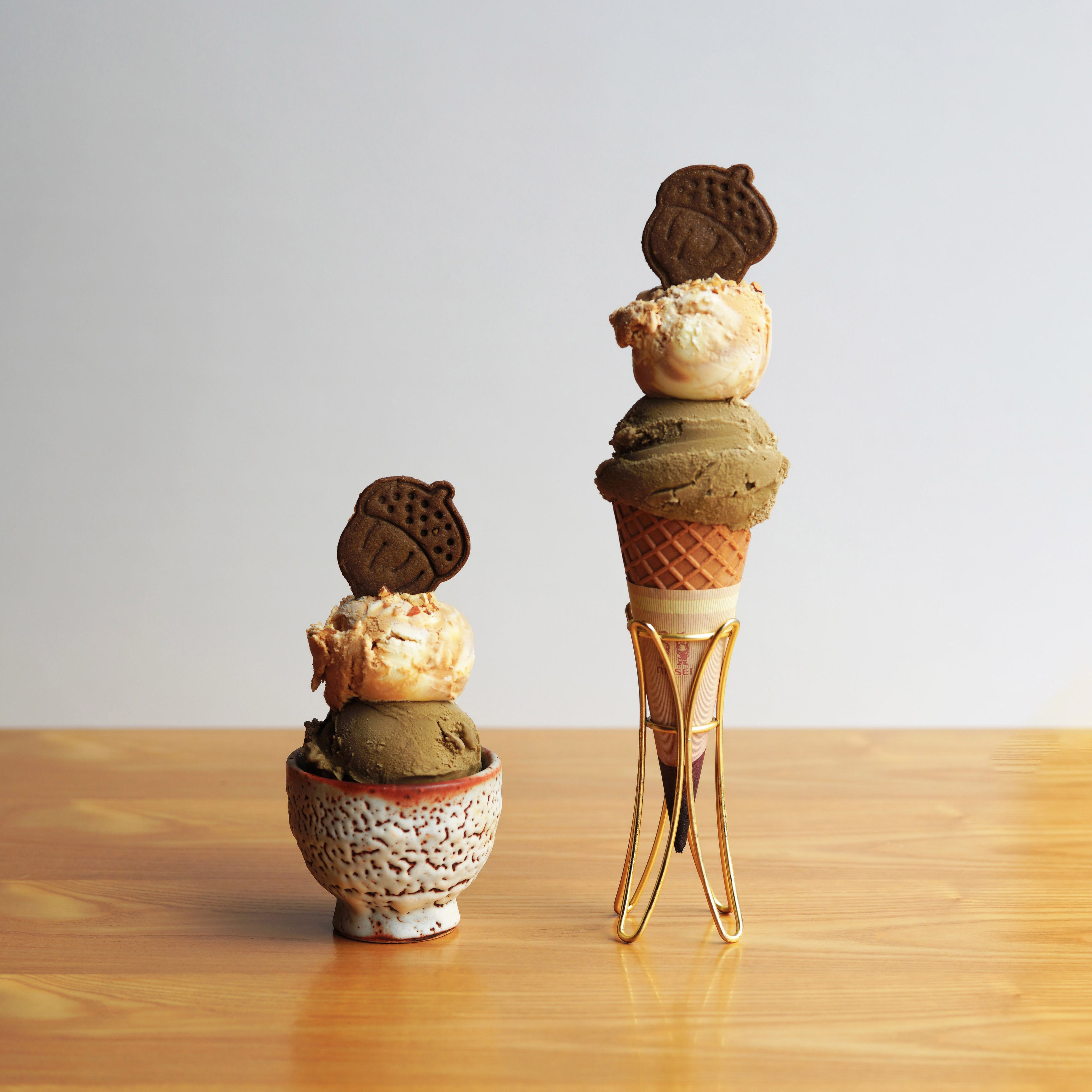 焙じ茶とキャラメルバニラの2種盛り!どんぐりの形の手作り焙じ茶クッキーをトッピングしました。