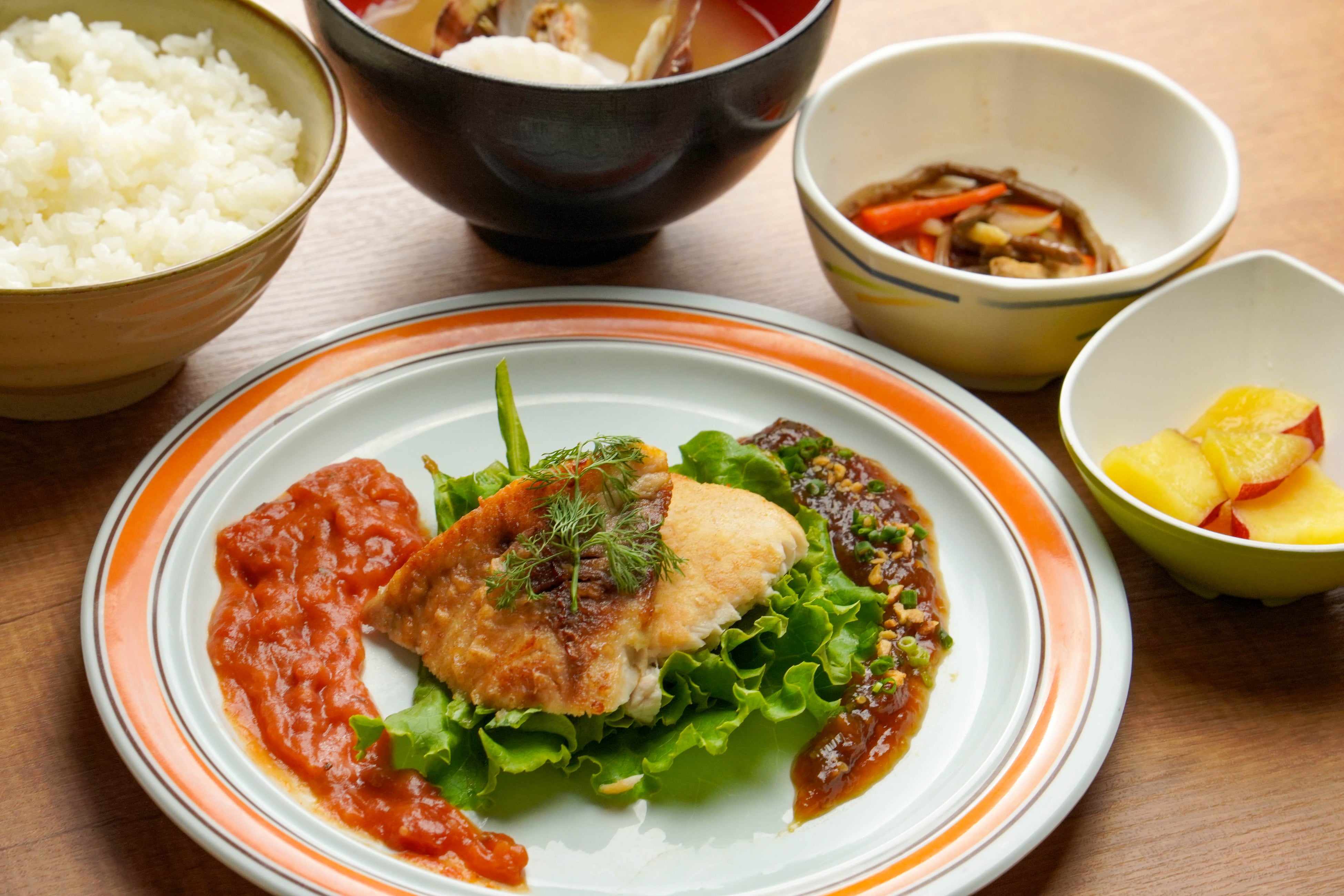 ■ 宮城県産メカジキのソテー定食 ガーリック醤油&トマトWソース 950円(税込み)