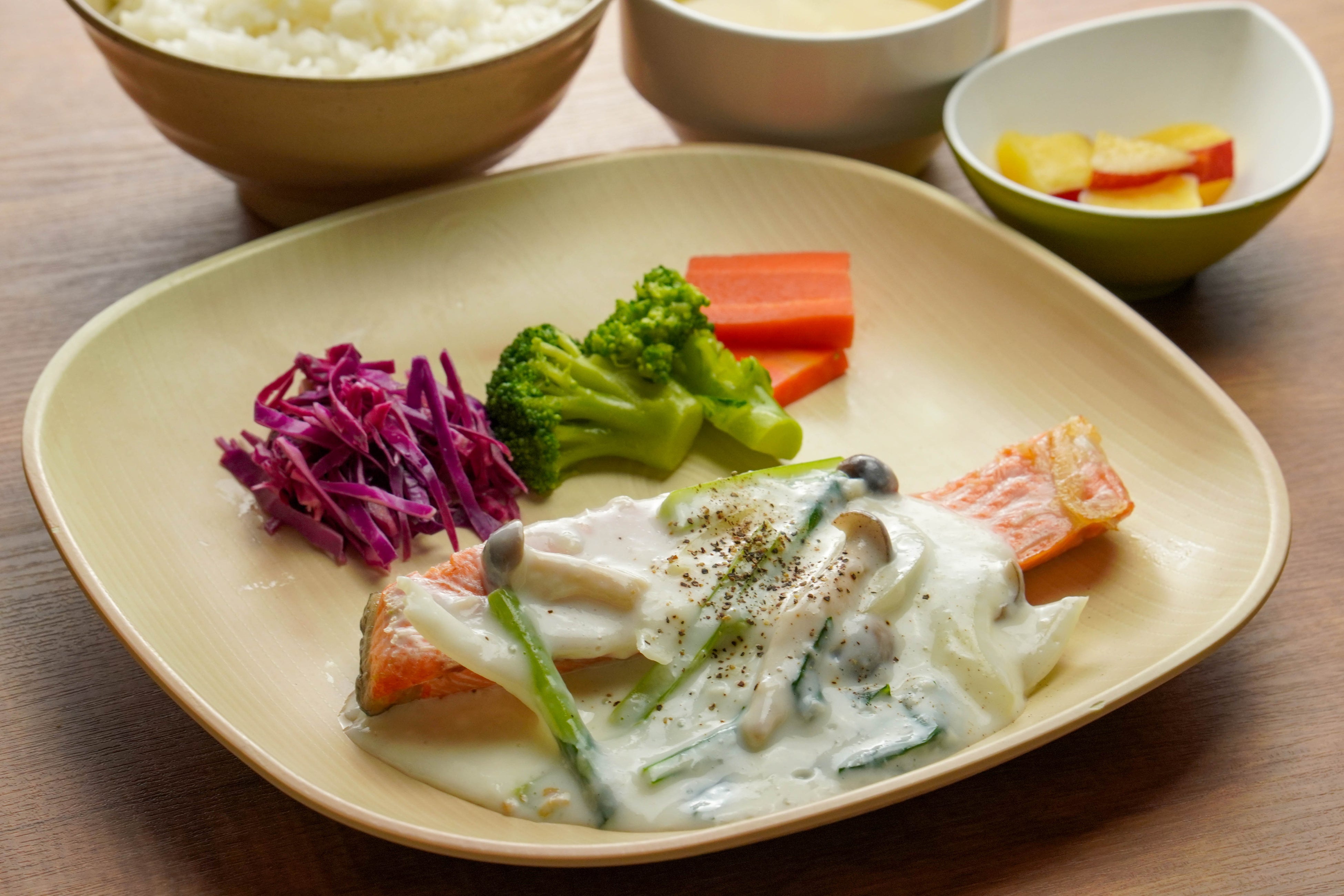 鮭はビタミンDが豊富です。油といっしょに調理することで効果的に摂取ができます。銀鮭は国産の90%が宮城県内で養殖されています。餌にこだわった銀鮭は臭みが無く、脂が程よくのっていることが特徴です。今回は管理栄養士メニューとしてこだわりの調理法で提供します。