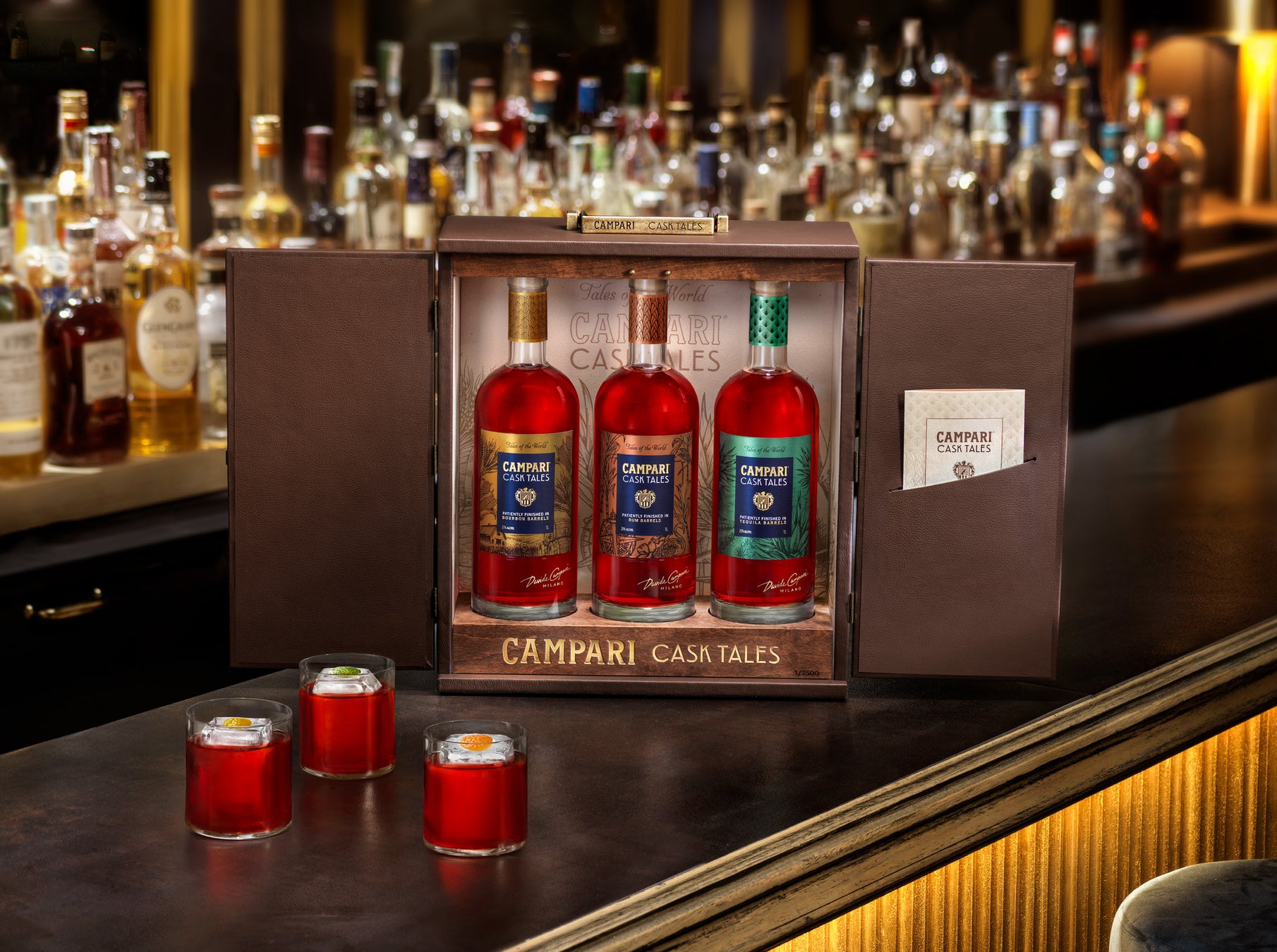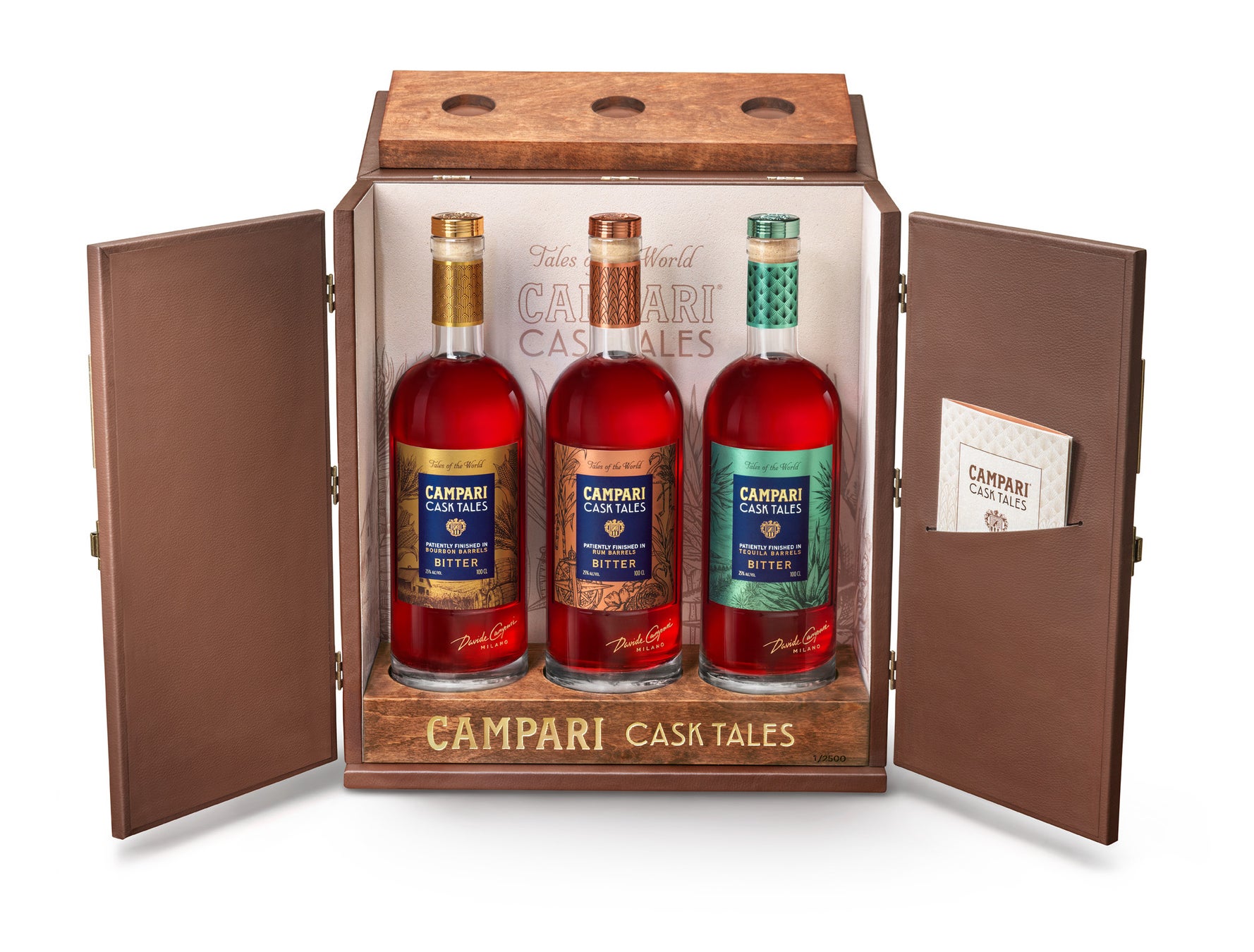 厳選されたアメリカ産バーボン(ワイルドターキー)樽、ジャマイカ産ラム(アプルトンエステート)樽、メキシコ産テキーラ(エスポロン)樽でそれぞれフィニッシュを施した、プレミアムなカンパリ3本が1セットとなった特別コレクション。豪華仕様の専用ボックスの表面はPUレザーを、ボトルを置く台座にはアルダー材(北米やヨーロッパを中心に分布している広葉樹)を使用しています。 さらに、台座には「CAMPARI」がゴールドで箔押しされ、シリアルナンバーも刻印されています。