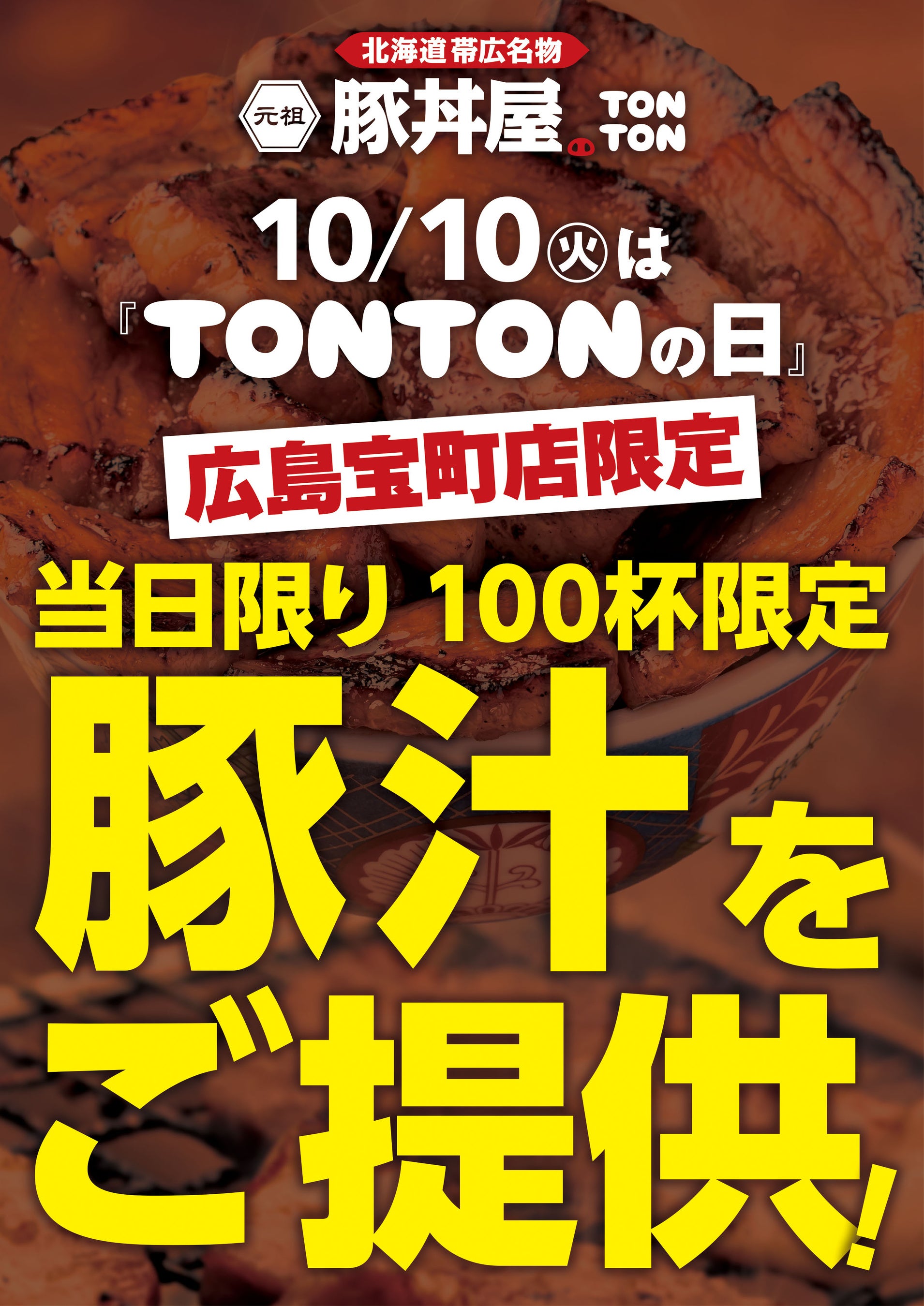 ワンズトライン株式会社(本社:大阪市北区芝田2丁目3番16号、代表取締役:山内仁)が運営する、北海道・帯広伝統の豚丼が人気の「元祖豚丼屋TONTON 広島宝町店」(住所:広島県広島市中区宝町6-30、TEL:082-909-9450)で、’23年10月10日(火)「TONTONの日」にスペシャルイベントを開催いたします。
