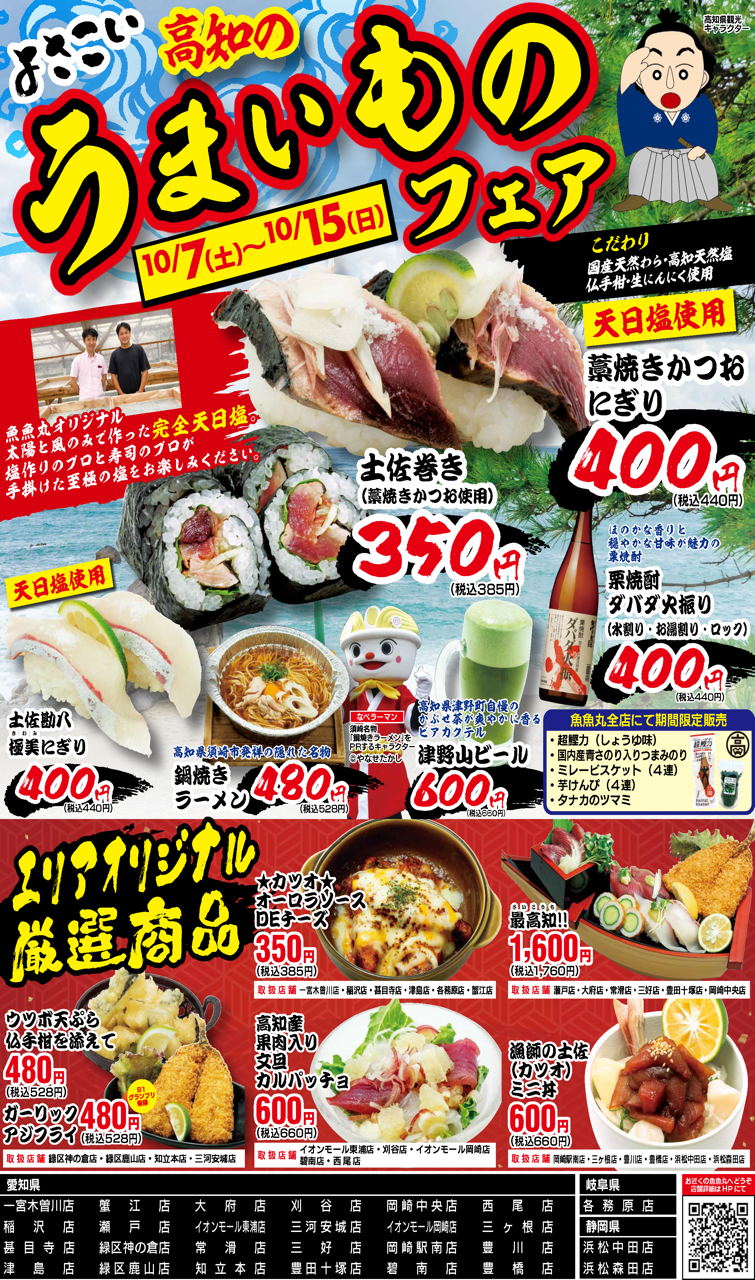 ととの日イベントと同時に10月7日(土)〜15日(日)に高知の美味しいものを集めたうまいものフェアを実施します。店内で焼く藁焼きかつおを使ったにぎりや土佐巻き、そして太陽と風のみで作った完全天日塩と一緒に提供させていただく土佐勘八極美にぎりなどが登場します。とことん高知の食材にこだわったフェアとなっており、食材等は一般財団法人高知県地産外商公社様協力の元、産地より直送しております。また店舗エリアを5つに分けてエリアオリジナルの厳選商品も提供させていただきます。