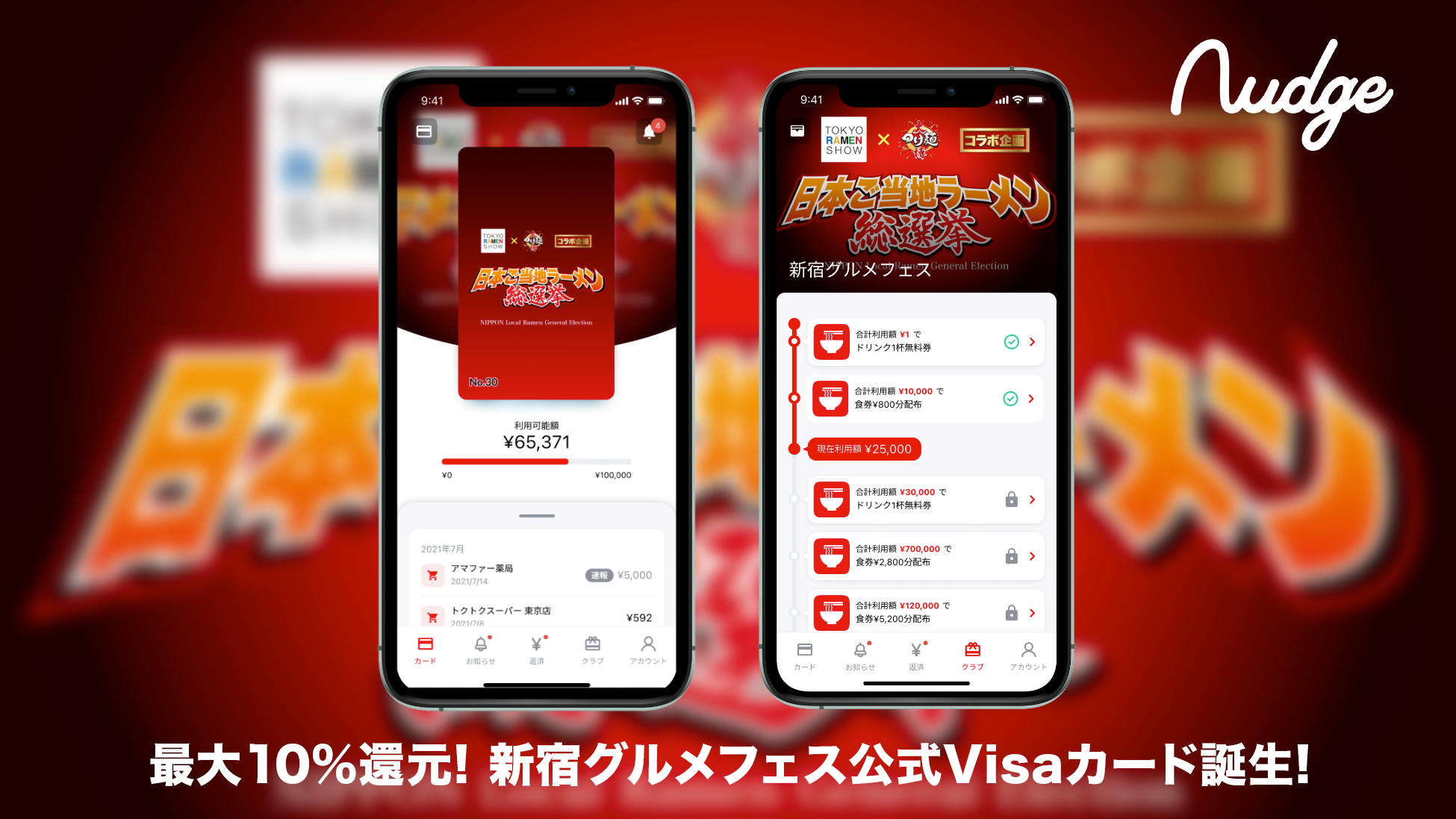 「新宿グルメフェス」クラブでは、過去に「激辛グルメ春祭り」や「刺激と旨辛FES」といったイベントを特典対象としており、ユーザーは様々な期間限定イベントをNudgeカード一枚でお得に楽しむことができます。また、異なるジャンルのクラブへ変更することもできるため、クレジットカードを楽しく使い続けていただくことが可能です。