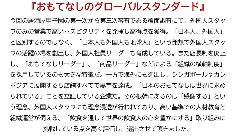 居酒屋甲⼦園は、外⾷産業の活性化と飲⾷業界に携る⽅々がより誇りを持てるように、居酒屋を夢を語る場所に、⼦供たちの憧れの職業にするという想いで19年間歩んできました。