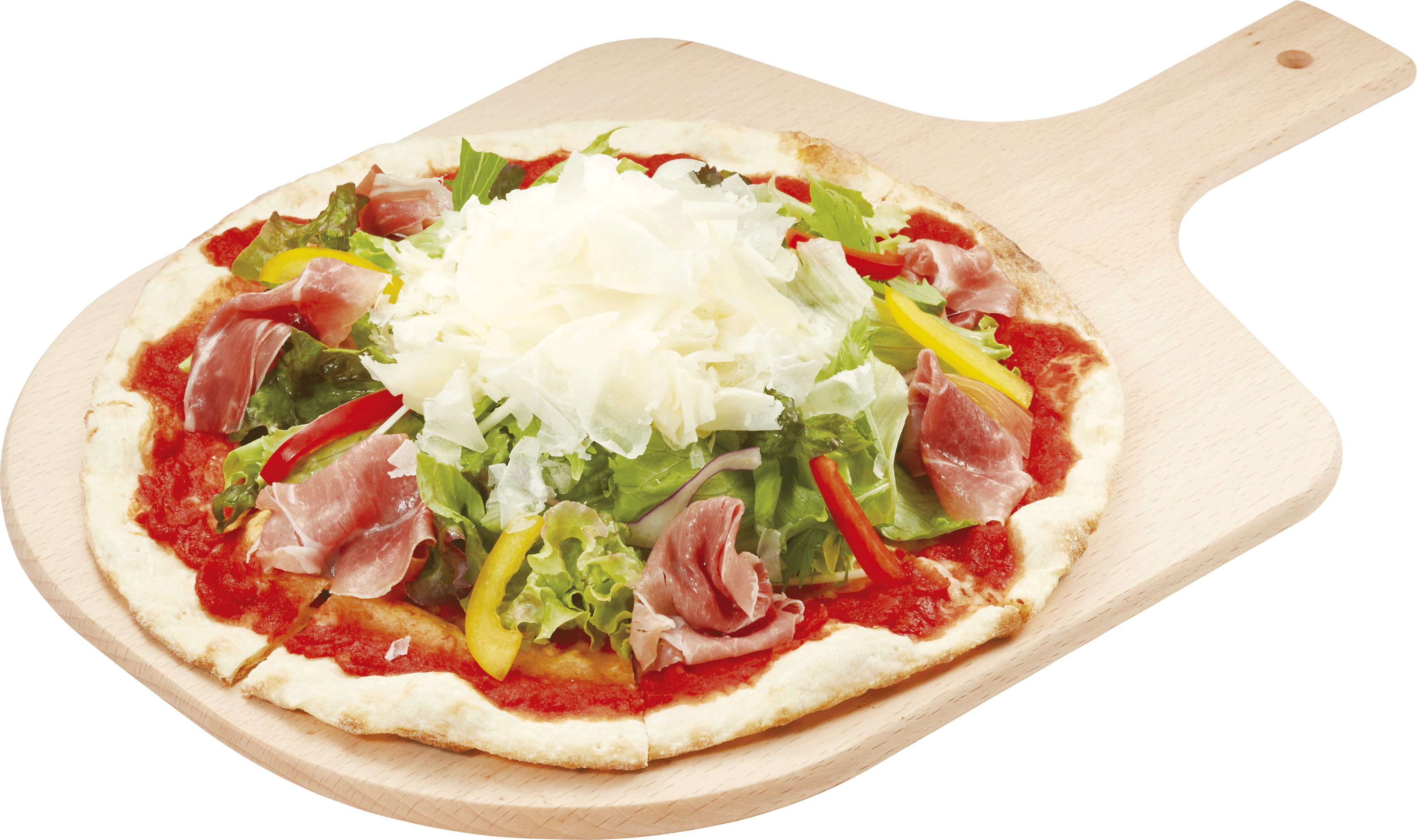 ピッツァカテゴリーに、サラダ感覚でお召し上がりいただける商品が登場します。クリスピーなピザ生地に、レタスやパプリカなどの野菜と熟成生ハム、パルメザンチーズを羽のように薄く削った“フェザーチーズ”をたっぷりのせました。別添えのシーザーソースをかけてお召し上がりください。