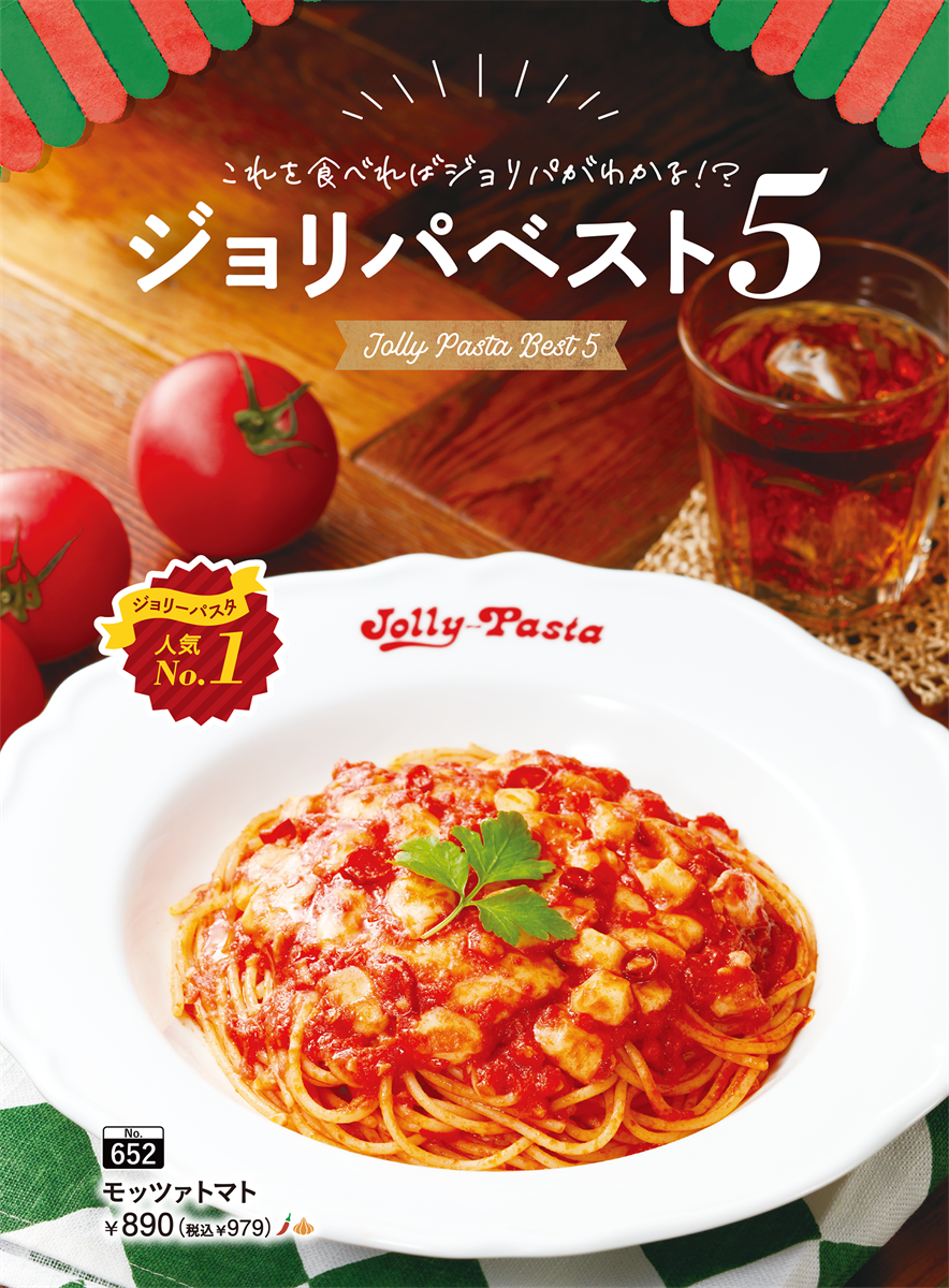 今回のグランドメニューでは、新たに「ジョリパベスト5」というページが登場します。ジョリーパスタは誕生して今年で40年。これまで本当においしいパスタとは何かを考え、味わいや食感を科学的に分析することでその答えを追求してきました。定番商品も改良を重ね、常に進化し続けています。このコーナーでは、特にお客様にご支持いただいているメニューを取り上げ、商品への想い、特長を紹介しています。ぜひご覧ください。
