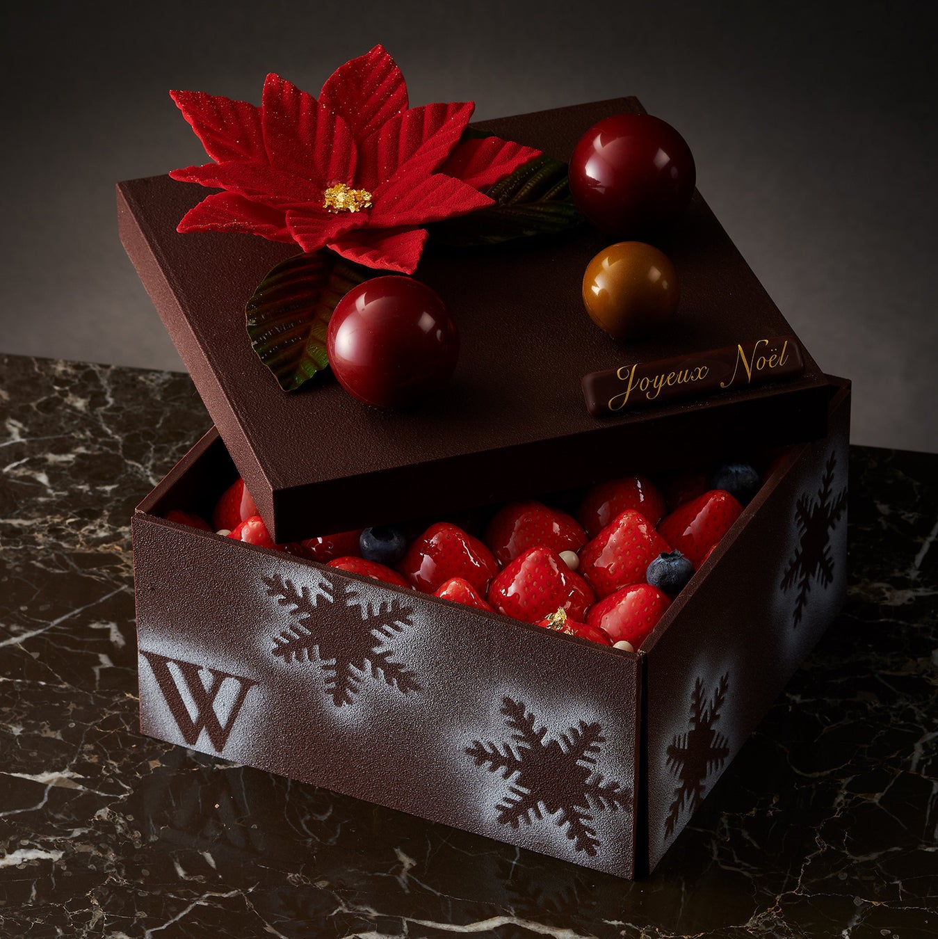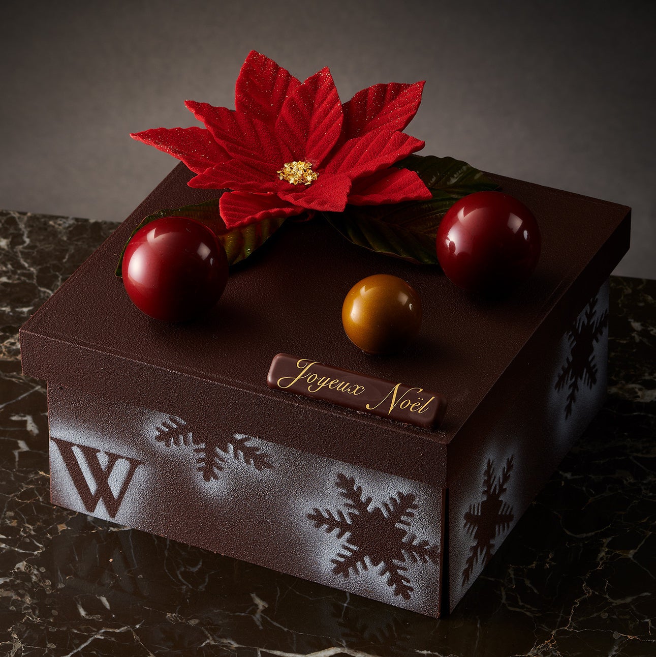プレゼントを開けるときのようなワクワク感をケーキでも。そんな想いで、ショコラティエがひとつひとつ手作りした真っ赤なポインセチアが印象的なチョコレートのボックス。