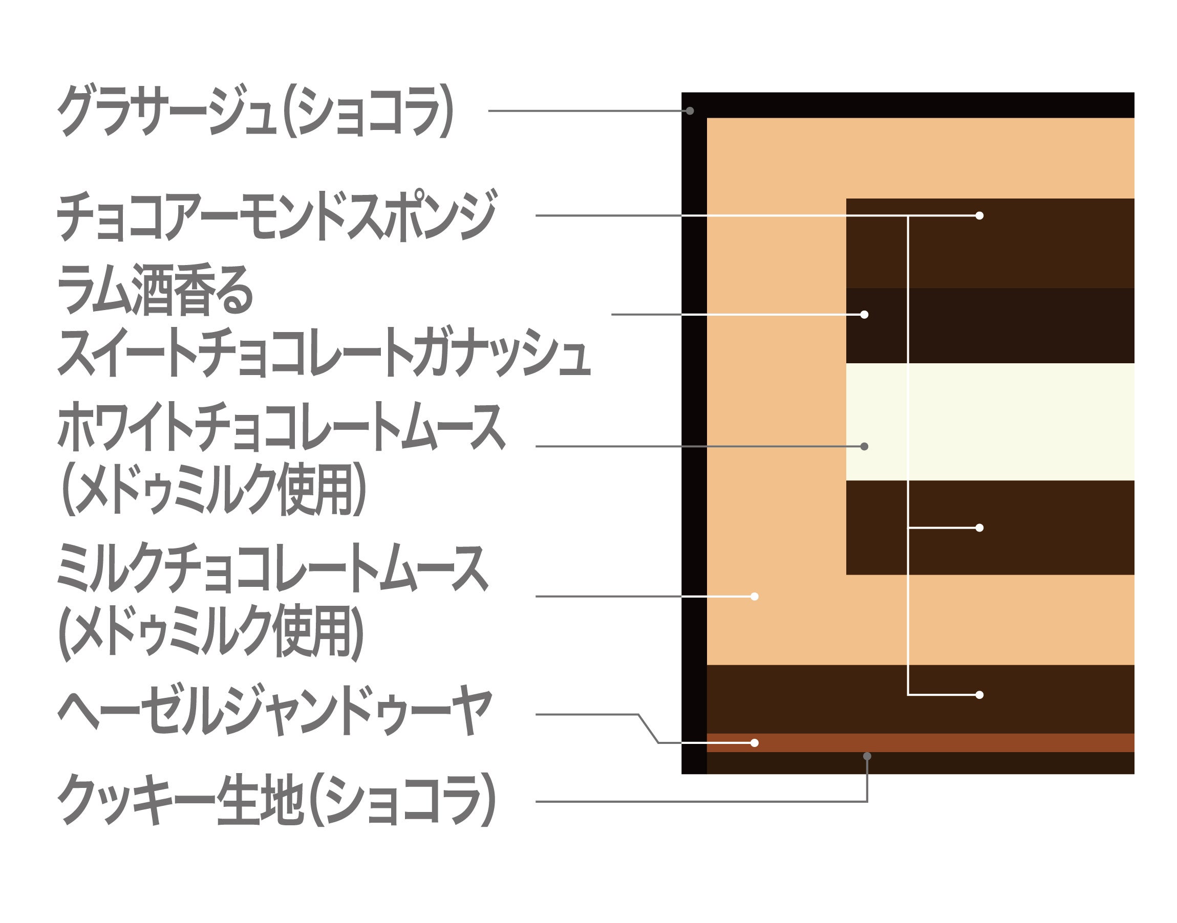 そのミルクチョコレートを使用したムースの中には、ラム酒が香るエクアドル産カカオのスイートチョコレートガナッシュと、メドゥミルクを使用したホワイトチョコレートのムースをとじ込めて。