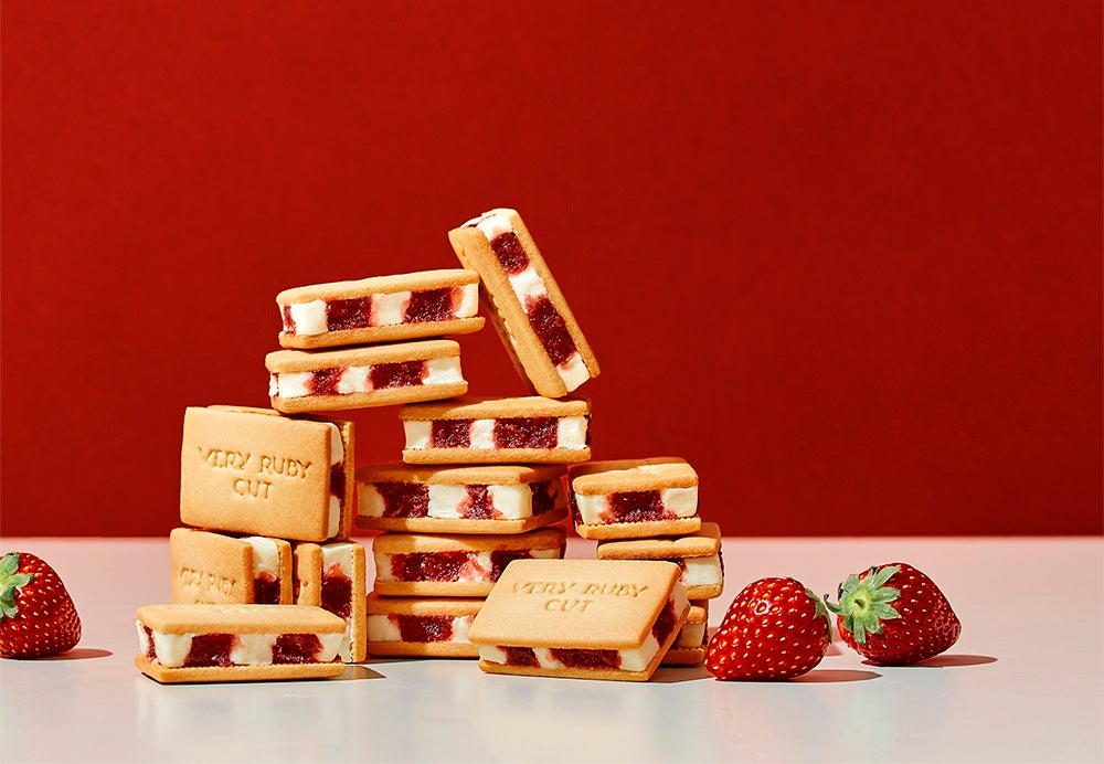 「Very Ruby Cut」の魅力を最も体感できる代表作がこちら。おすすめNo.1ギフト『いちごミルクサンド』です。指先にしっとり吸い付いて、お口の中に苺とホワイトショコラがとろっと溢れるやわらか食感にきっと驚いてしまいます。当店自慢のミルクサンド、ぜひ頬張ってみて!