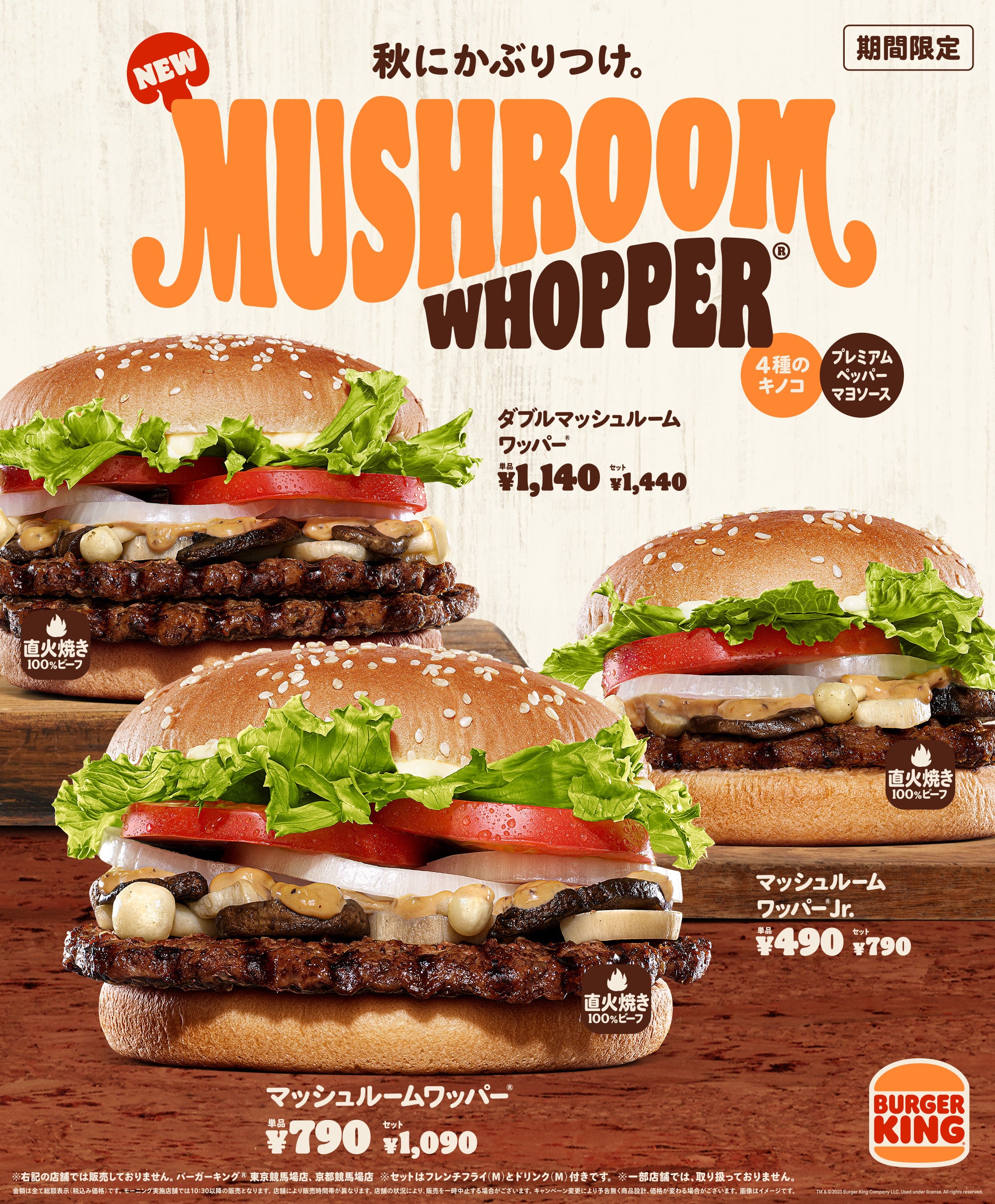 きのこ好きの皆様も、バーガーキング® ファンの皆様も、焦がし醤油香るクリーミーなプレミアムペッパーマヨソースと贅沢な4種のきのこがジューシーな直火焼きビーフにベストマッチした『マッシュルームワッパー® 』『ダブルマッシュルームワッパー® 』『マッシュルームワッパー® Jr.』3商品で食欲の秋をお楽しみください。