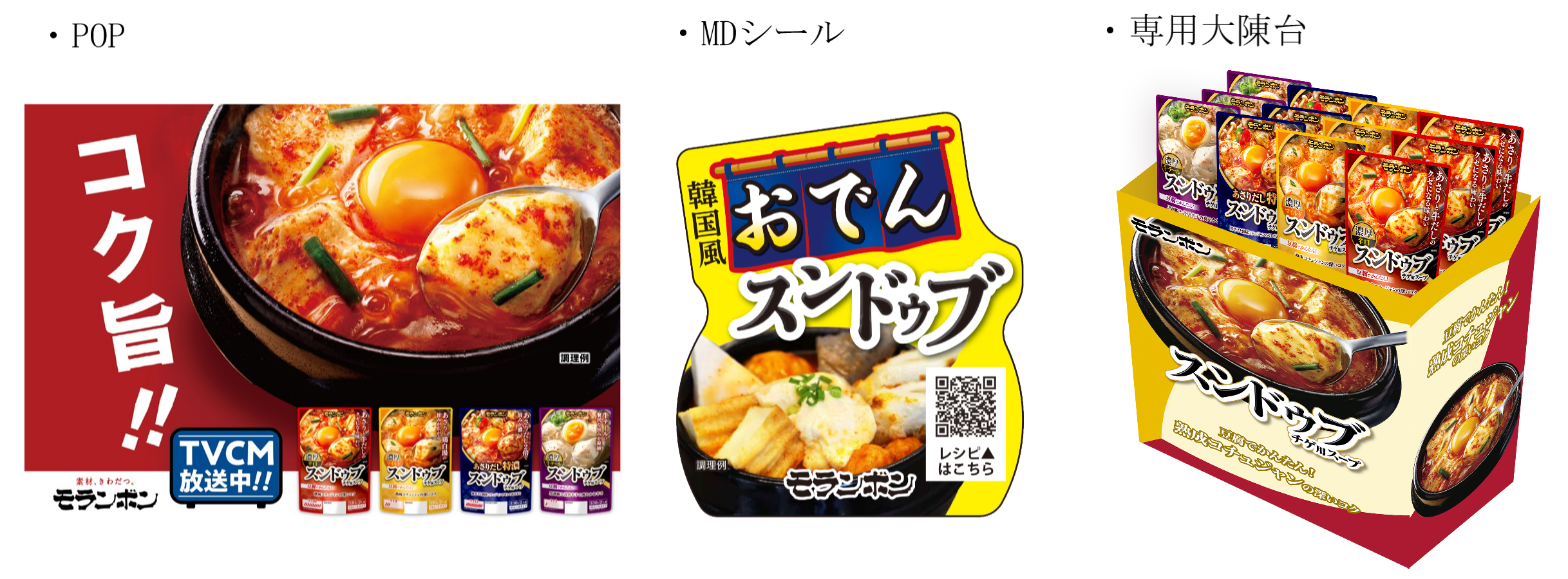 店頭用POPやMDシール、専用大陳台などの販促ツールを活用しながら、スンドゥブチゲ用スープの認知拡大およびメニュー浸透を図ります。またアレンジレシピとして「韓国風おでんスンドゥブチゲ」を提案し、スンドゥブチゲの幅広いメニュー提案を行います。