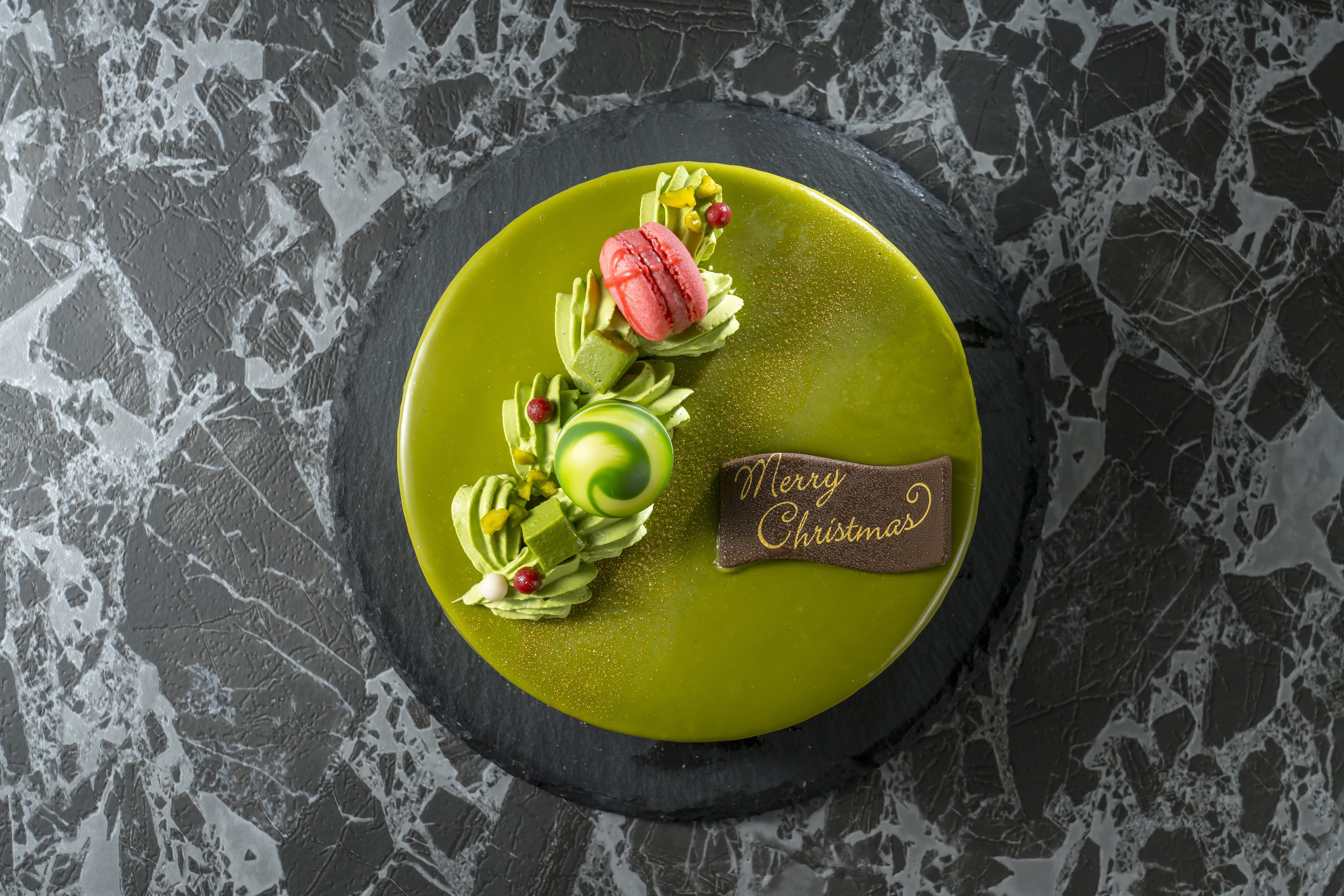 美しいケーキの表情を彩るデコレーションに使用しているのは、「抹茶生クリーム、抹茶生チョコレート、ラズベリーマカロン、ピスタチオ、飾りチョコ(チョコプレート、緑色のボールチョコ、ホワイトとフランボワーズのパールチョコ)」。全て食べられるデコレーションで統一し、クリスマスムードを高めてくれる美しさはもちろん、主役のケーキの美味しさを更に引き立てるようにこだわりを込めて仕上げています。