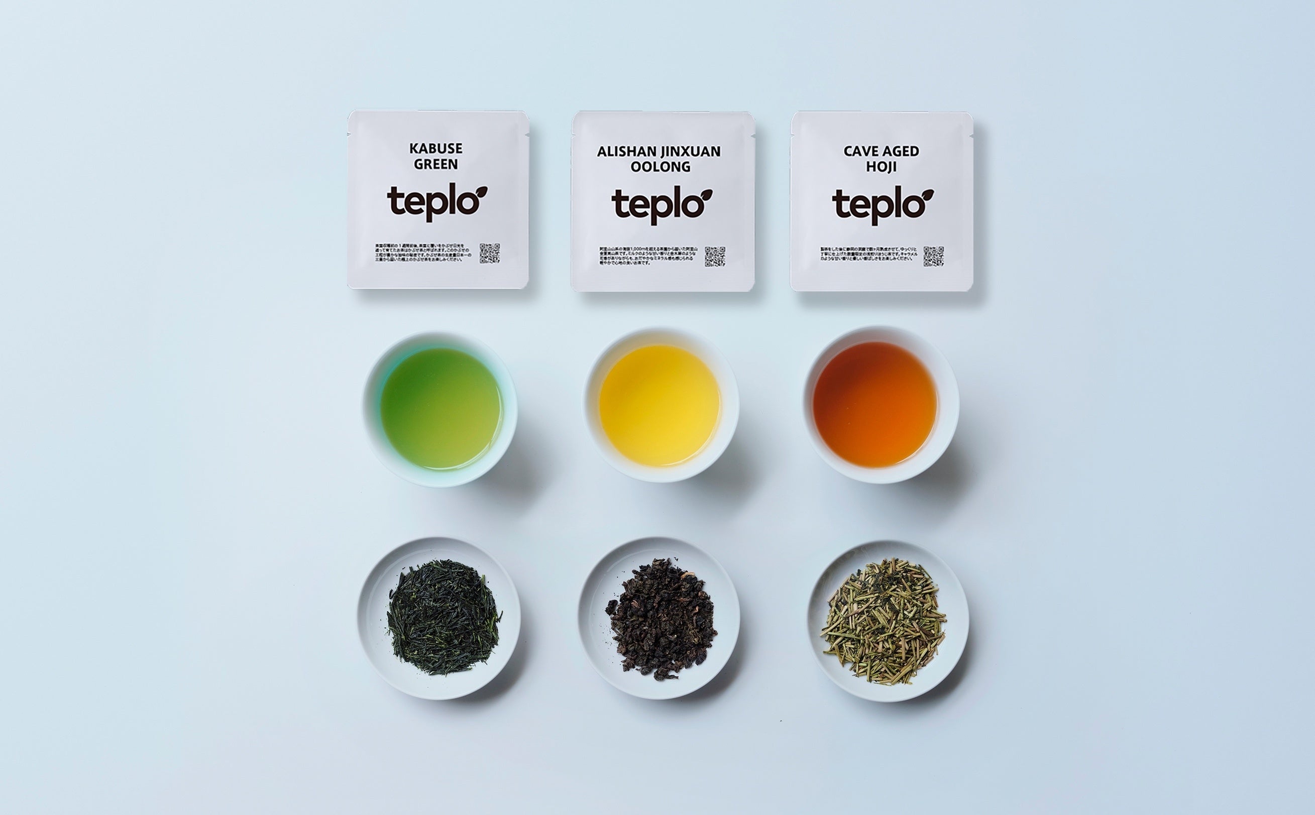 teplo公式茶葉はリーフタイプの茶葉です。茶葉本来の香りを毎回新鮮な状態で楽しんでもらうため、無着香の茶葉のみを取り扱い、抽出1回分に個包装しています。パッケージのQRコードを公式アプリで読み取るとお茶の情報が表示されるほか、当社が提供するティーメーカー「teploティーポット」での抽出設定を行うことができます。