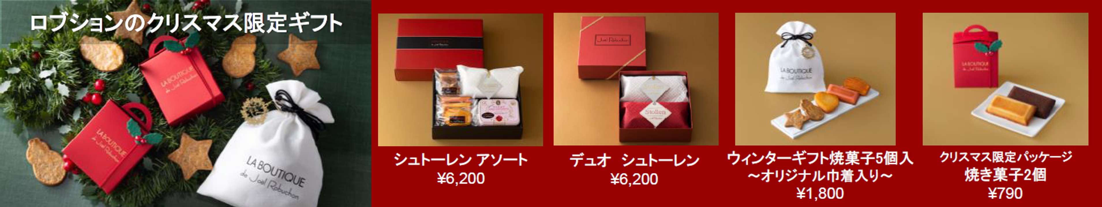 【シュトーレン・クリスマス限定商品 販売概要】 「ロブションのシュトーレン」:大(化粧箱入りのみ) 4,700円/小 2,800円/小(化粧箱入り) 3,150円 「シュトーレンショコラ」:3,000円/化粧箱入り 3,350円 「シュトーレン アンペリアル ~シャインマスカットとソーテルヌワインを使って~」:12,000円 「シュトーレン アソート」 :6,200円 「デュオ シュトーレン」:6,200円 「ウィンターギフト焼き菓子5個入」:1,800円 「焼き菓子2個入り」 ※クリスマス限定パッケージ :790円 販売期間: 下記2商品以外 2023年11月1日(水)~12月下旬 売り切れ次第終了 「シュトーレン アンペリアル」2023年12月11日(月)~上限数に達し次第終了(予約開始2023年11月1日(水)) 「ノエル限定焼き菓子2個」2023年12月 1日(金)~売り切れ次第終了 販売店舗: ラ ブティック ドゥ ジョエル・ロブション全店(恵比寿ガーデンプレイス店、六本木ヒルズ店、丸の内ブリックスクエア店) ル パン ドゥ ジョエル・ロブション全店(渋谷ヒカリエ ShinQs 東横のれん街店、ニュウマン新宿店) ルカフェ ラブティック ドゥ ジョエル・ロブション 虎ノ門ヒルズ店 ジョエル・ロブション公式オンラインショップ https://www.robuchon-online.jp/fs/robuchon/c/Seasonal |