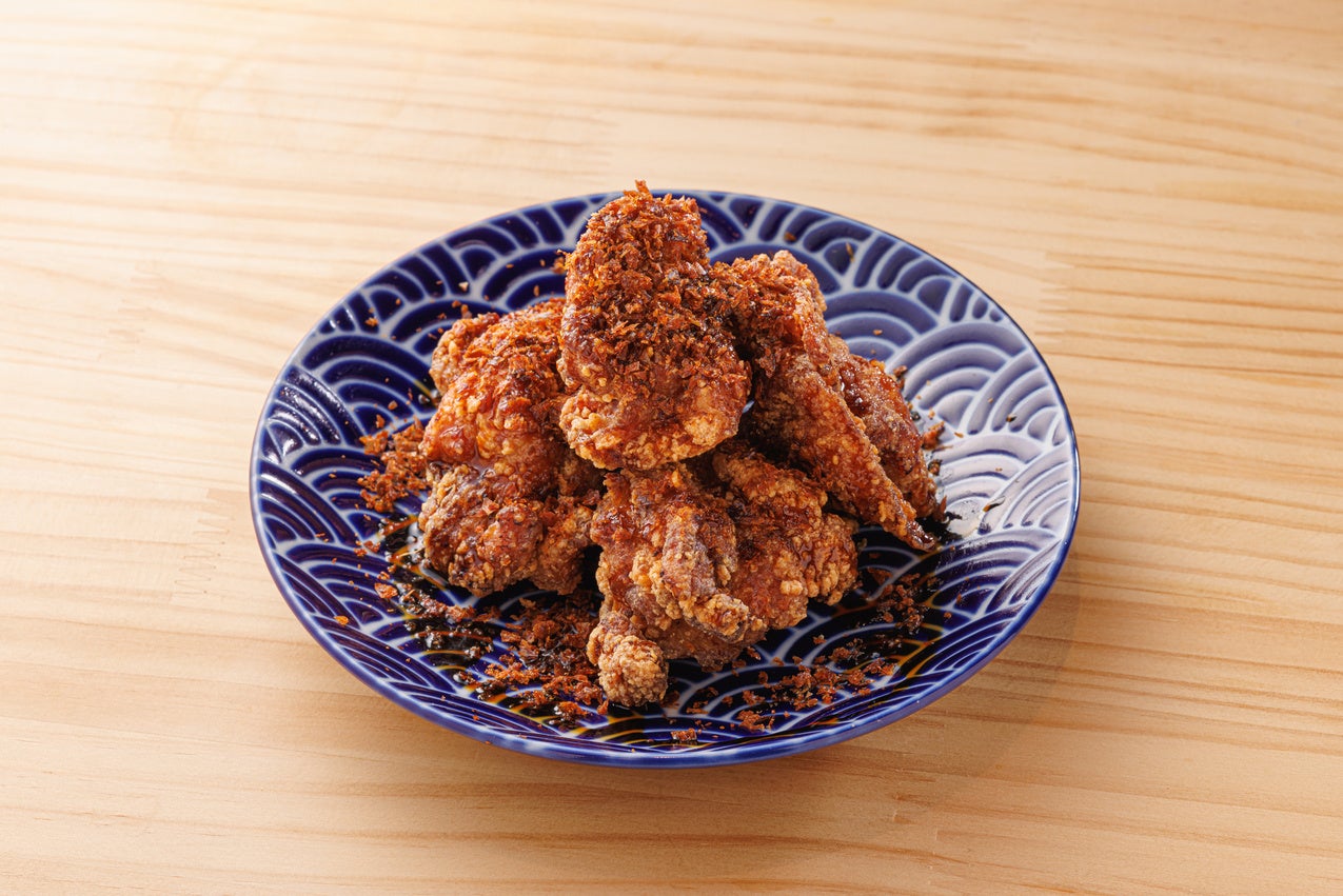 衣にまとうパリッと食感のかつおふりかけと甘辛い手羽先風のタレが相性抜群の逸品です。