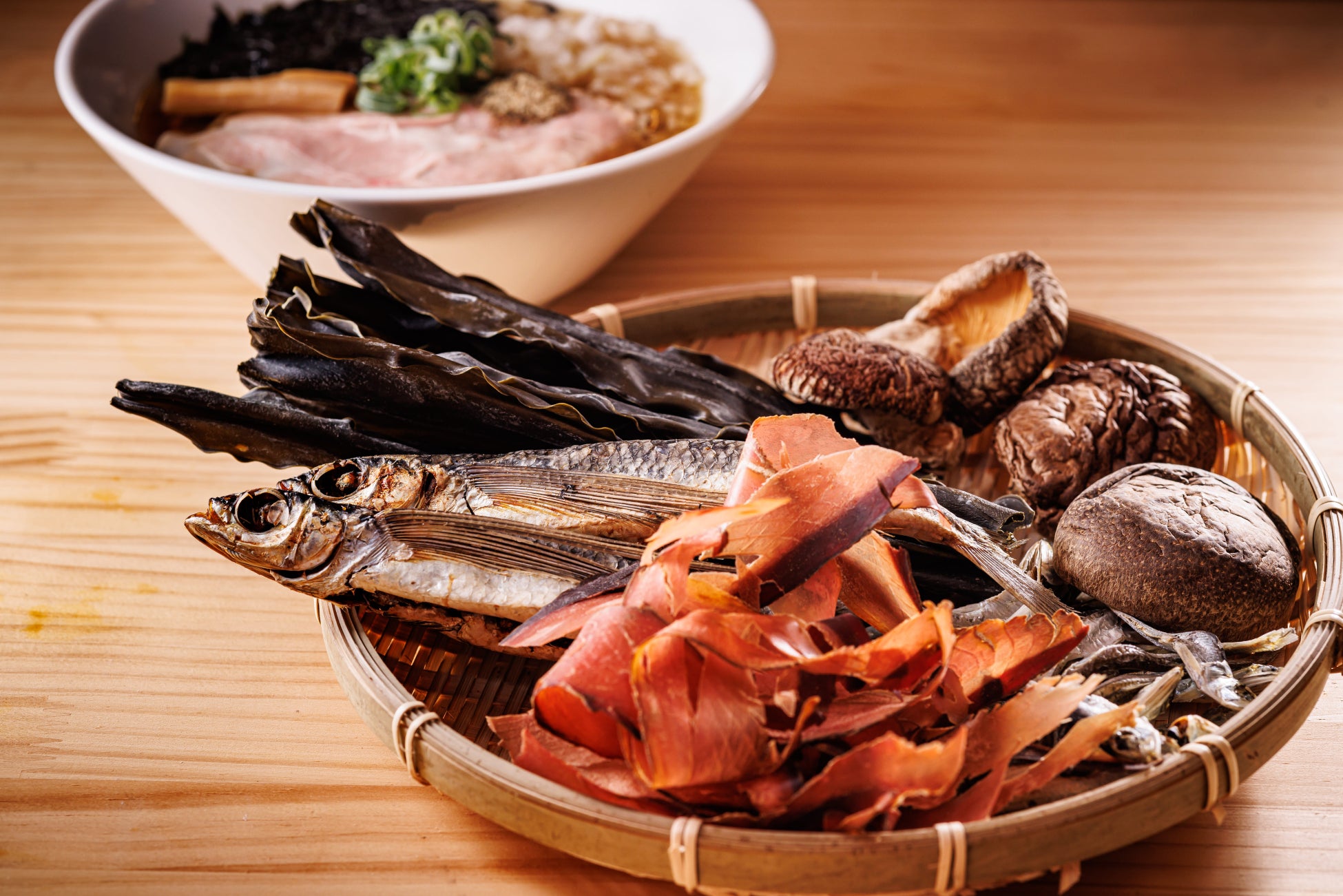 「アゴ煮干し」「利尻産昆布」「小豆島煮干し」「千葉本枯節」「国産干ししいたけ」。