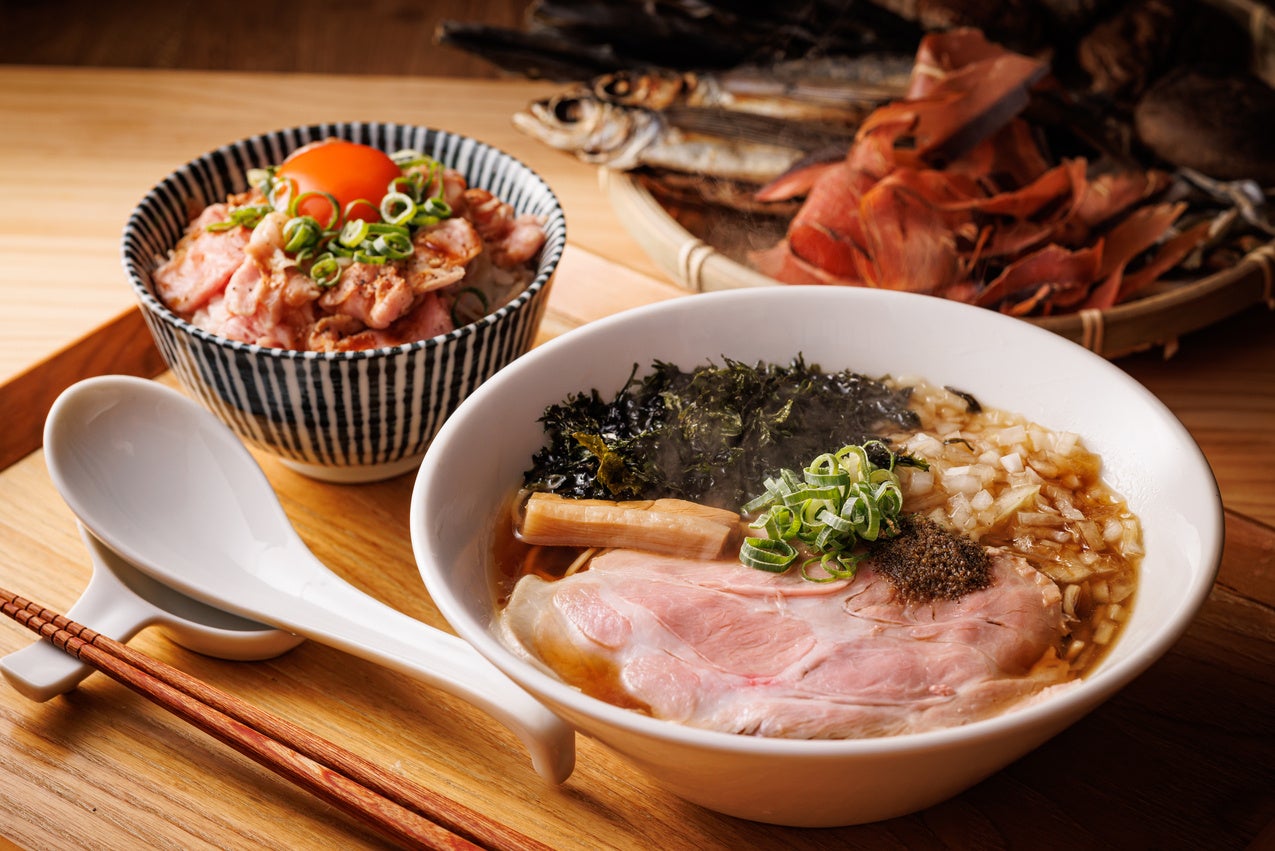 低温加熱で90分間じっくり丁寧に煮込み、老舗蔵元の再仕込み醤油や国産親鳥を独自の製法でブレンドさせました。素材は、「アゴ煮干し」「利尻産昆布」「小豆島煮干し」「千葉本枯節」「国産干ししいたけ」を使用しており、それぞれの長所が混ざり合うことで、何層にも渡る味のハーモニーをお楽しみください。