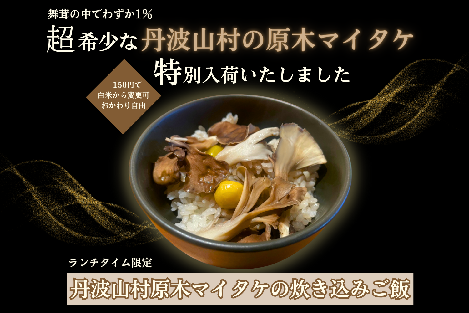 10月6日(金)~13日(金)の期間中、ランチメニューにプラス¥150で、原木マイタケの旨味が豊かに香る“丹波山村原木マイタケの炊き込みご飯”に変更可能です。(炊き込みご飯・白米ともにおかわり無料)