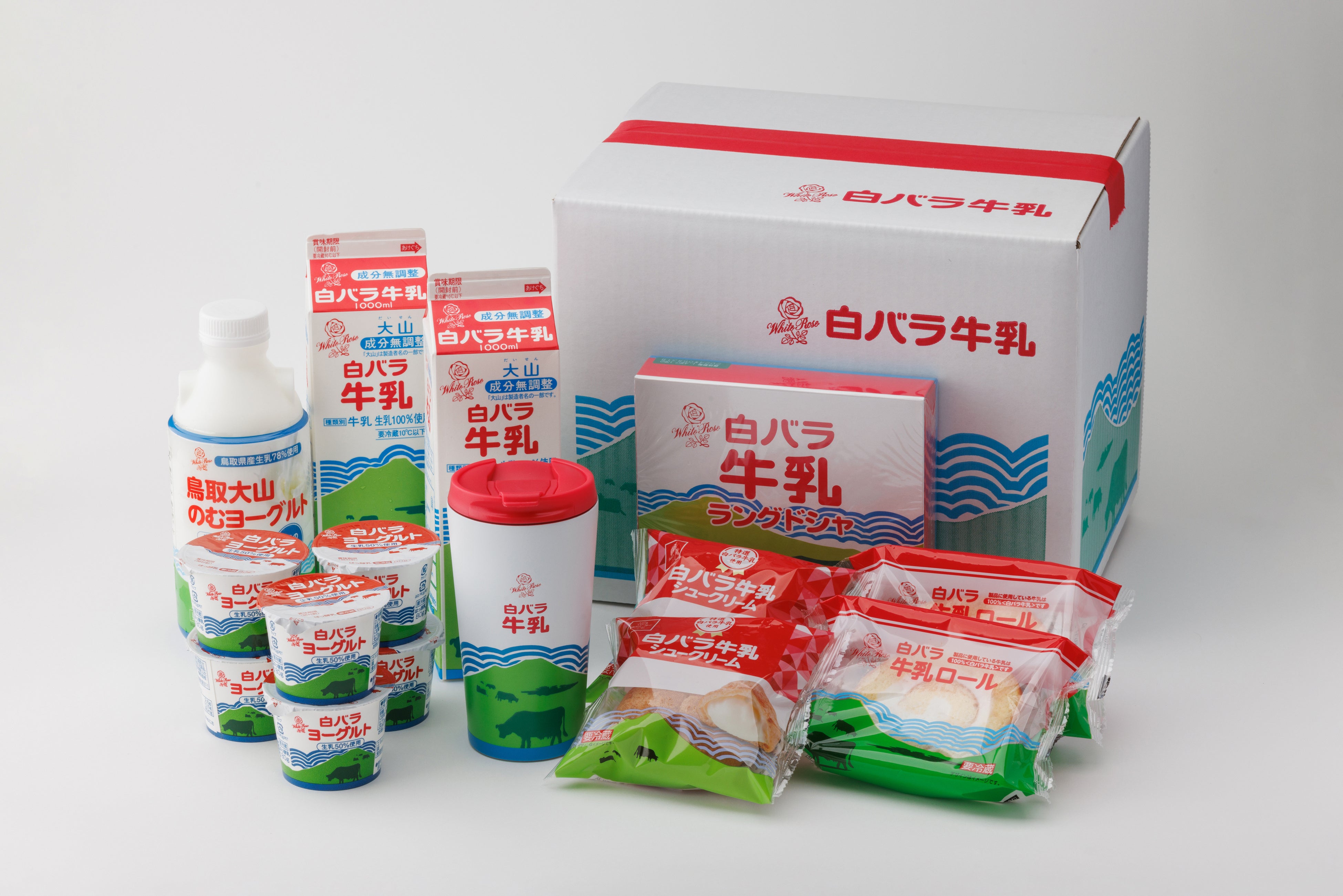 セット内容:白バラ牛乳1000ml×2、鳥取大山のむヨーグルト750ml×1、白バラヨーグルト(80g×3)×2、白バラ牛乳シュークリーム×2、白バラ牛乳ロール×2、白バラ牛乳ラングドシャ10枚入り×1、白バラ牛乳タンブラー×1