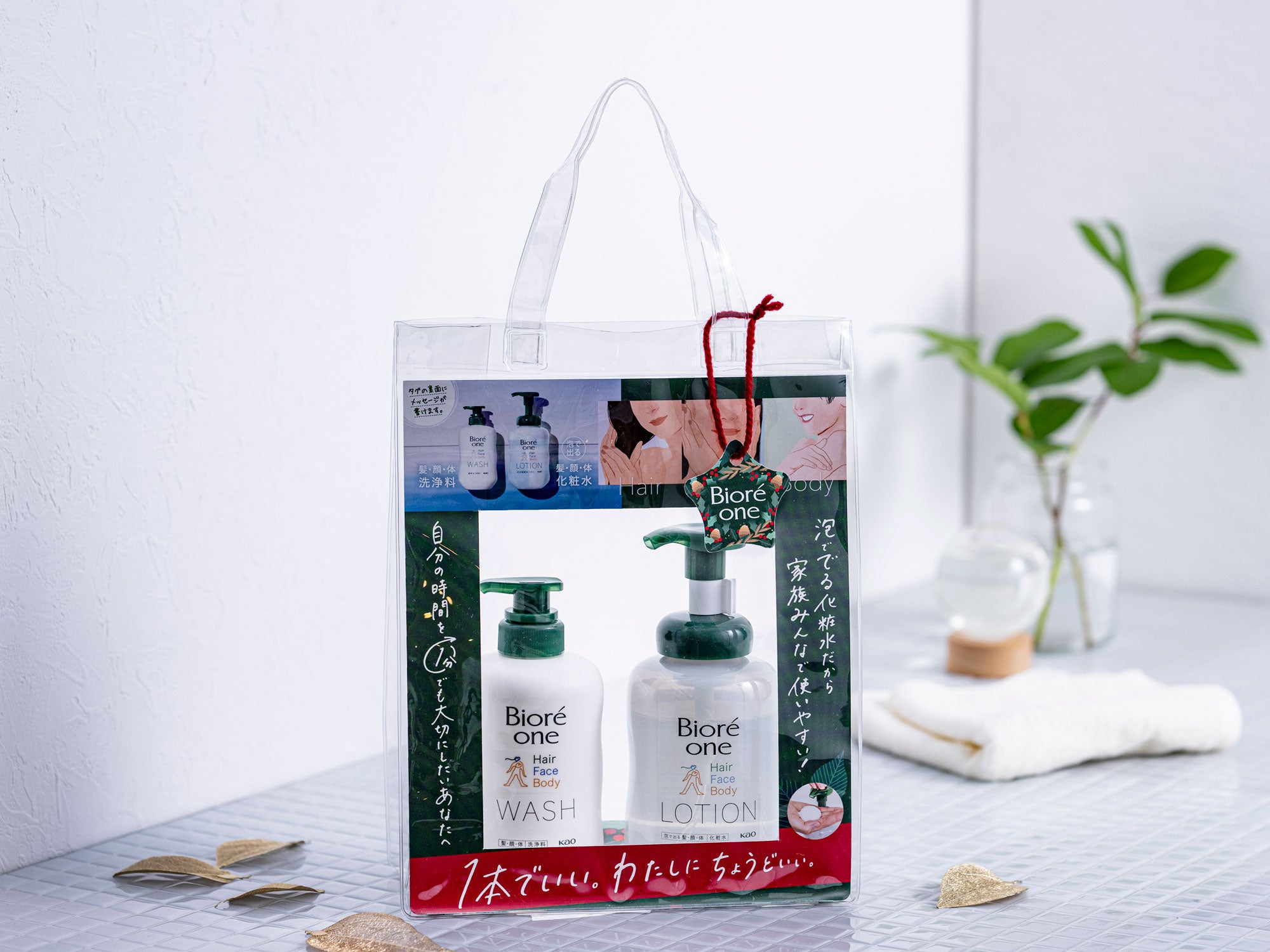 1本で髪・顔・体すべてに使える洗浄料と化粧水がセットになって登場しました。秋冬をイメージした特別なパッケージは、生活空間に溶け込むシンプルなデザインです。メッセージが書ける丸POP付きで、プレゼントにもおすすめです。