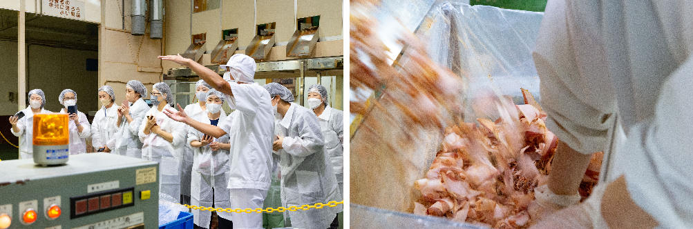 「つゆの素」や「つゆの素ゴールド」で使用している削り節の生産工場です。「フレッシュパック」等の削り節類やふりかけの製造も行っています。つゆの素の原料となる「鰹荒節」が削られていく様子などを間近で見学しました。