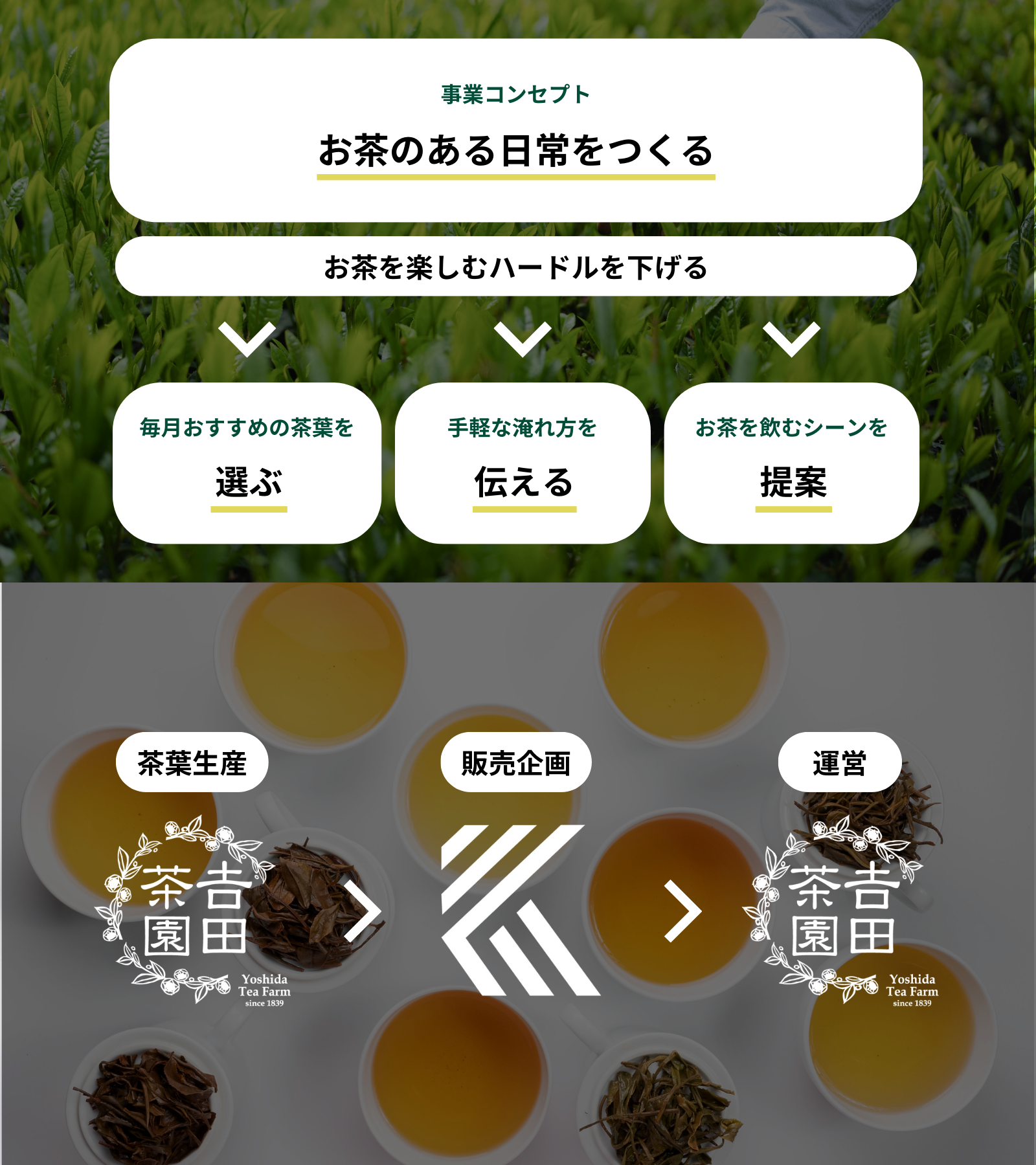 「体に優しい効能が含まれている」「日本特有の味覚うまみから落ち着きを感じられる」といった様々な魅力のたくさん詰まった日本茶がこのまま人目に触れずに無くなってしまうのは勿体無い。そんな課題感を約180年お茶の生産に従事している吉田茶園は抱えていました。何とかこの課題を解決したいと同じ茨城県古河市で事業を展開する当社が相談を受け、共同で新規事業を起こす運びとなりました。