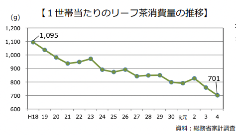 日本国内の1世帯当たりの茶葉の消費量は平成18年から徐々に減少し令和4年には平成18年から約36%も減少しています。(※1)