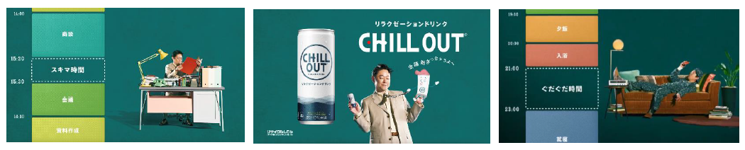 また、10月6日(金)からは俳優の阿部サダヲさんが出演するWEBムービー「仕事のスキマ時間」篇、「家のぐだぐだ時間」篇も公開します。スケジュールがぎっしりつまって仕事のスキマ時間に休めなかったり、家でついついぐだぐだ過ごしてしまう社会人を演じる阿部さんを、オリジナルキャラクターの「チルくん」が「CHILL OUT」でリラックスタイムに導くコミカルでかわいらしいムービーです。
