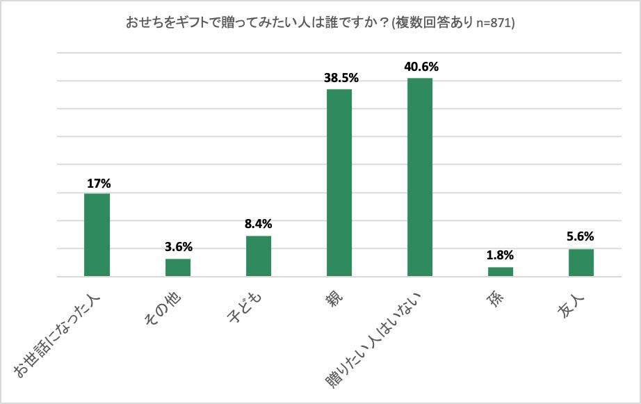 「おせちをギフトで贈ってみたい人は誰ですか」という質問に対して、「親」と回答した人が38.5%。また「お世話になった人」(17%)に贈ってみたいという回答もあり、「おせち料理」をギフトとして大切な人に贈ってみたいという気持ちが、この時期にみられることがわかりました。ただ、「贈りたい人はいない」が40.6%に上り、ギフトとしてのおせちは、まだ訴求の余地があると思われます。