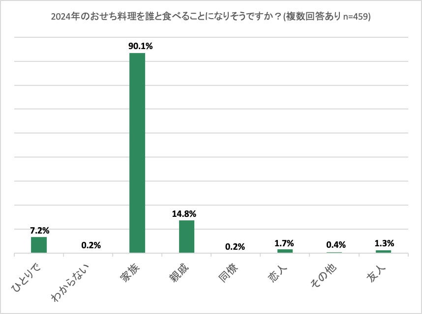 〇おせち料理を食べると回答した459人のうち、家族で食べると答えた人が9割。