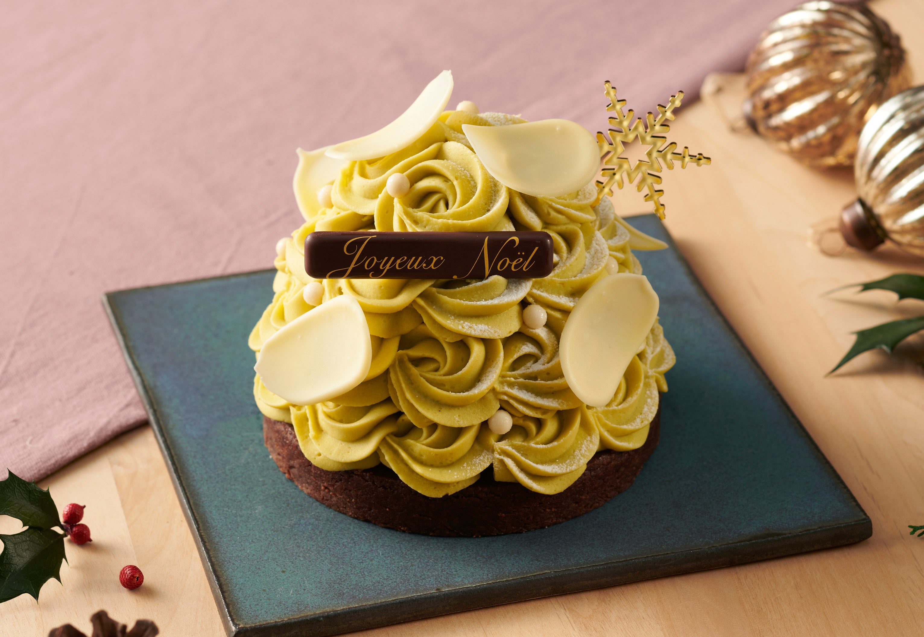 クリスマスツリーをイメージしたピスタチオのモンブラン。アールグレイで香りづけしたラムレーズンを香り高いピスタチオクリームとショコラムースにあわせて。ラムレーズンの余韻が心地よく広がる、贅沢な味わいの大人のクリスマスケーキ。