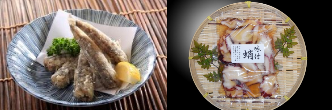 試食内容:➀味付けタコ ②めひかり唐揚げ