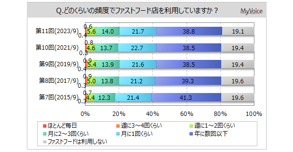 <今 回>(2023/9)https://myel.myvoice.jp/products/detail.php?product_id=30206 上記設問の他に、「最も好きなファストフード店」も聞いています。 <第10回>(2021/9)https://myel.myvoice.jp/products/detail.php?product_id=27805 <第9回> (2019/9)https://myel.myvoice.jp/products/detail.php?product_id=25405 |